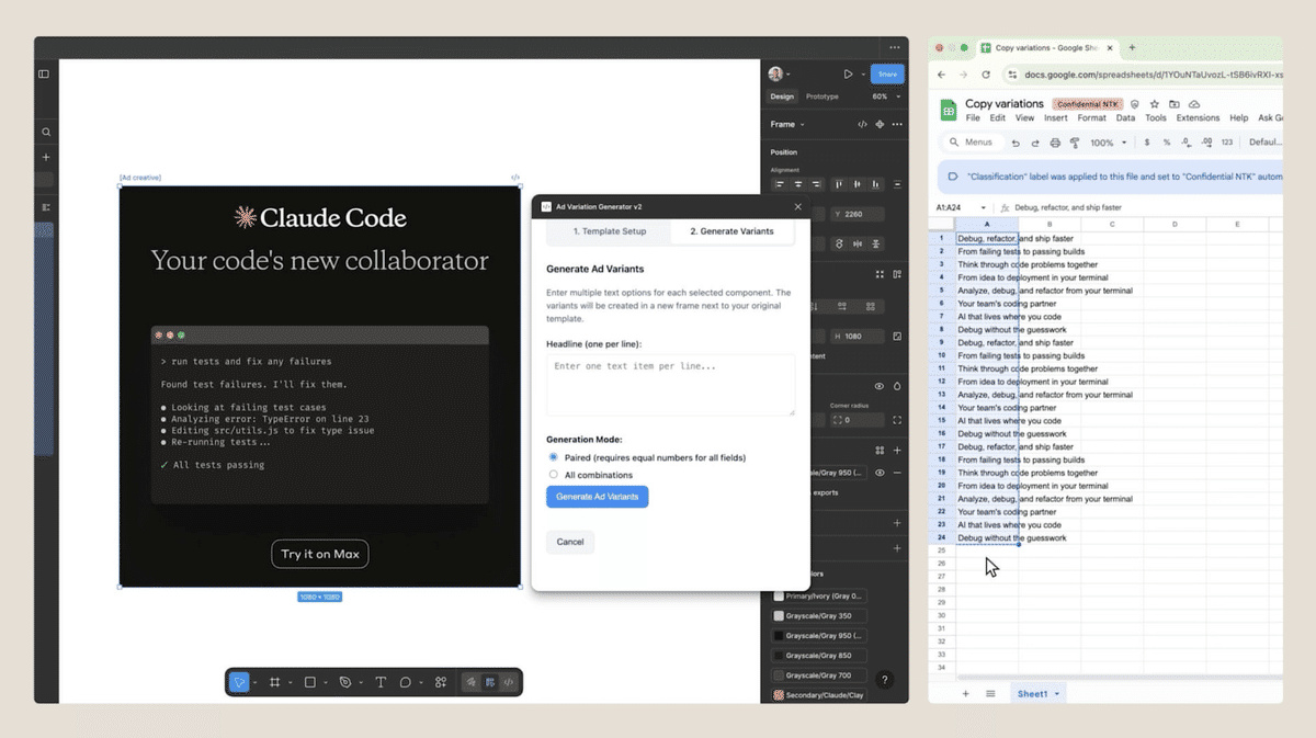 さらに、 Figmaプラグインを45分〜1時間で自作 し、1クリックで数十の広告バリエーションを生成できる環境を整えました。