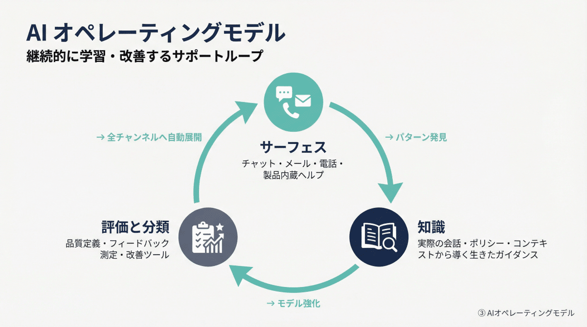サポートを継続的に学習し、改善する AI オペレーティングモデルとして再考するというビジョンです。