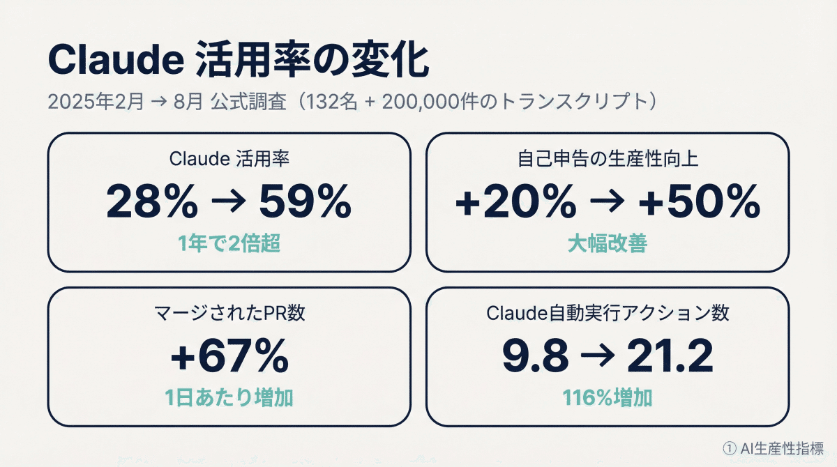 公式調査(エンジニア・研究者132名へのアンケート+200,000件のClaude Codeとのやりとり記録の分析)では、以下の変化が確認されています(2025年2月→8月比較)。