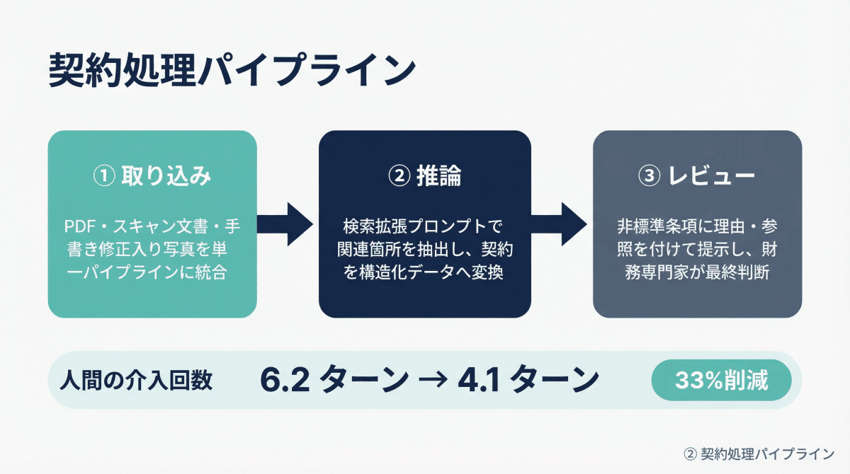 (3) レビュー:非標準条項に理由・参照を付けて提示し、財務専門家が最終判断する、という設計です。