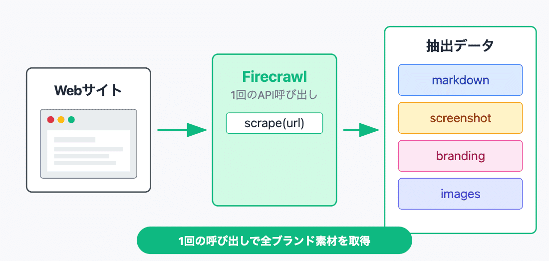 採用理由(Firecrawl): スクリーンショット、コンテンツ、画像リンク、ブランドカラーを1回のAPI呼び出しで全部スクレイプできる。これが決め手でした。