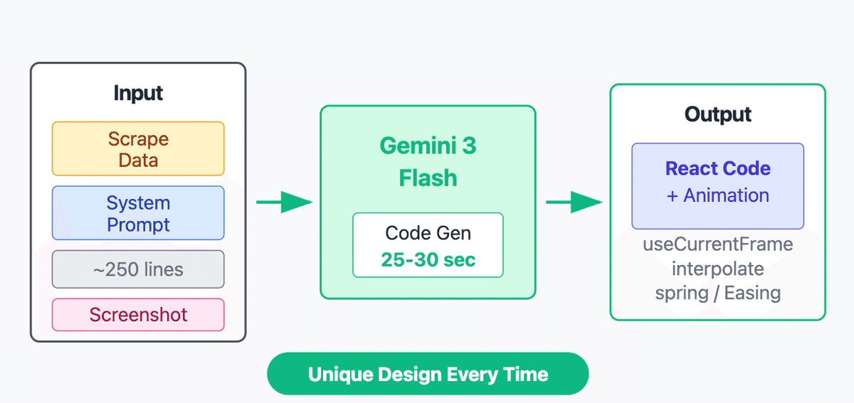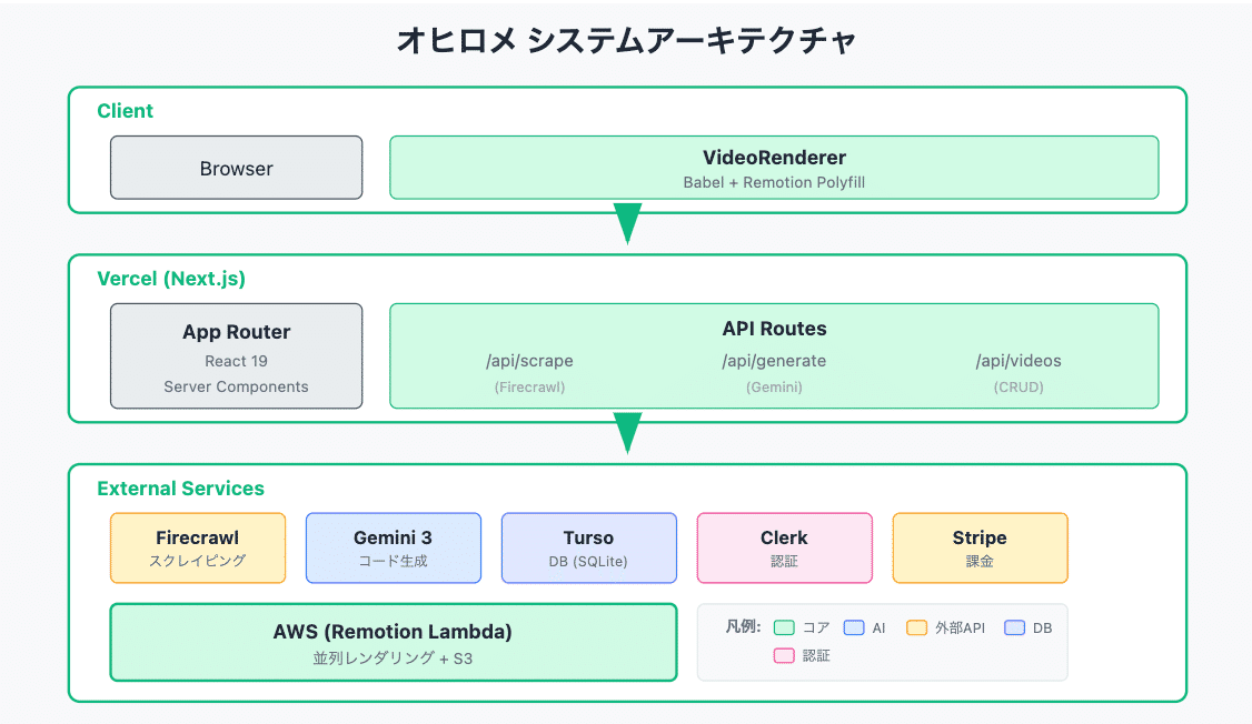 だから「AIを使ってるけど、AIを意識させない」プロダクトを目指しました。裏ではFirecrawl、Gemini Flash 3、Remotion とRemotion Lambdaが動いています。でもユーザーはそんなこと知らなくていいんです。