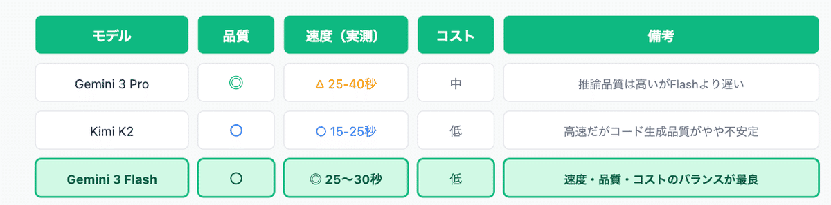 デザインのクオリティを重視すると、最初からGemini 3が本命でした。Googleが誇る最新のマルチモーダルモデルで、コード生成の品質が高い。その中でも最も重要な選定基準は「生成速度」でした。 1分以上待たされると、ユーザーのストレスが現実的ではありません。動画生成サービスとして、「URLを入れて、ちょっと待つと完成」という体験を提供するには、1分以内で動画が再生される必要があると感じました。