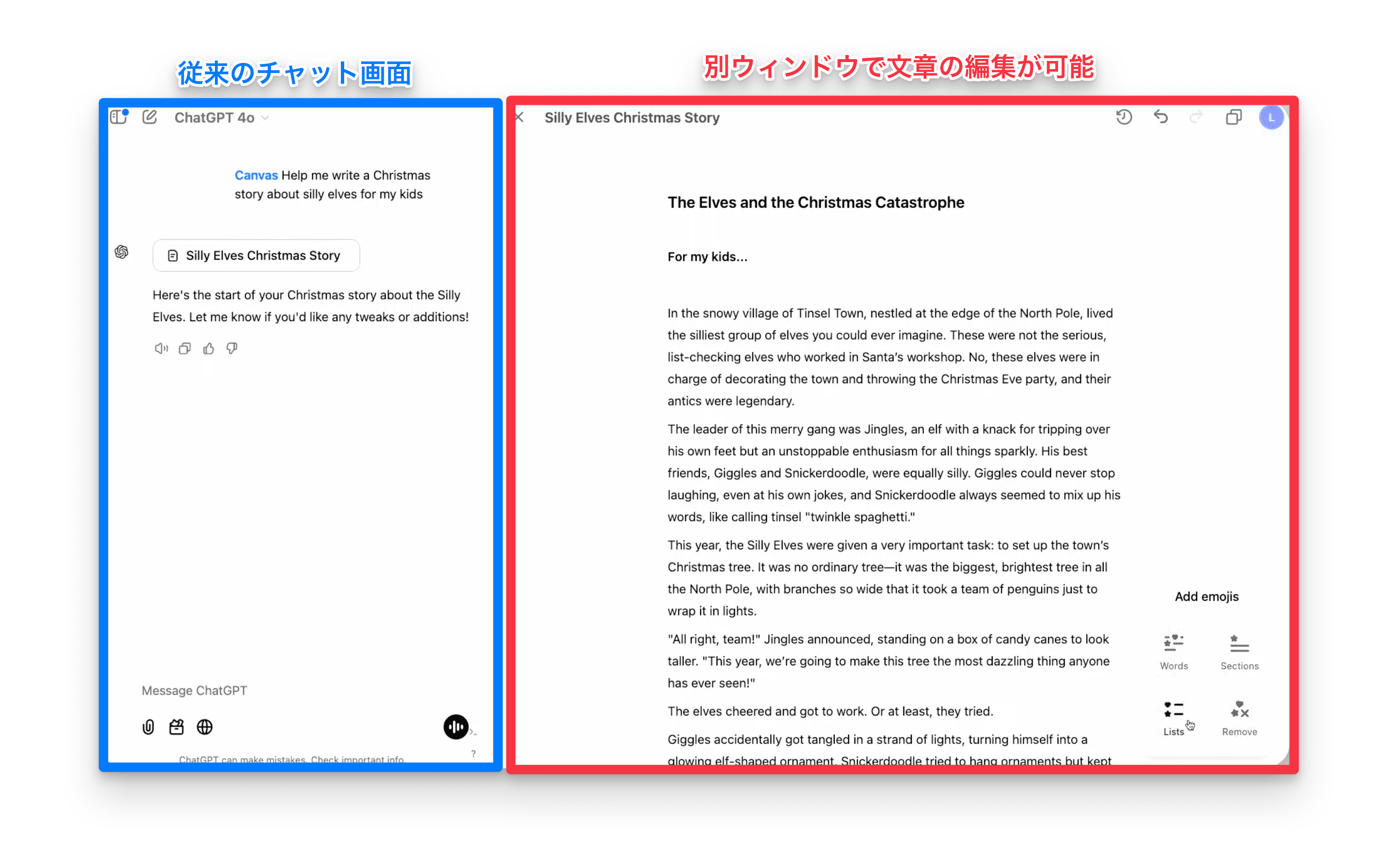 これにより、従来のテキストチャットを超えてChatGPTと別ウィンドウで共同作業を行えます。