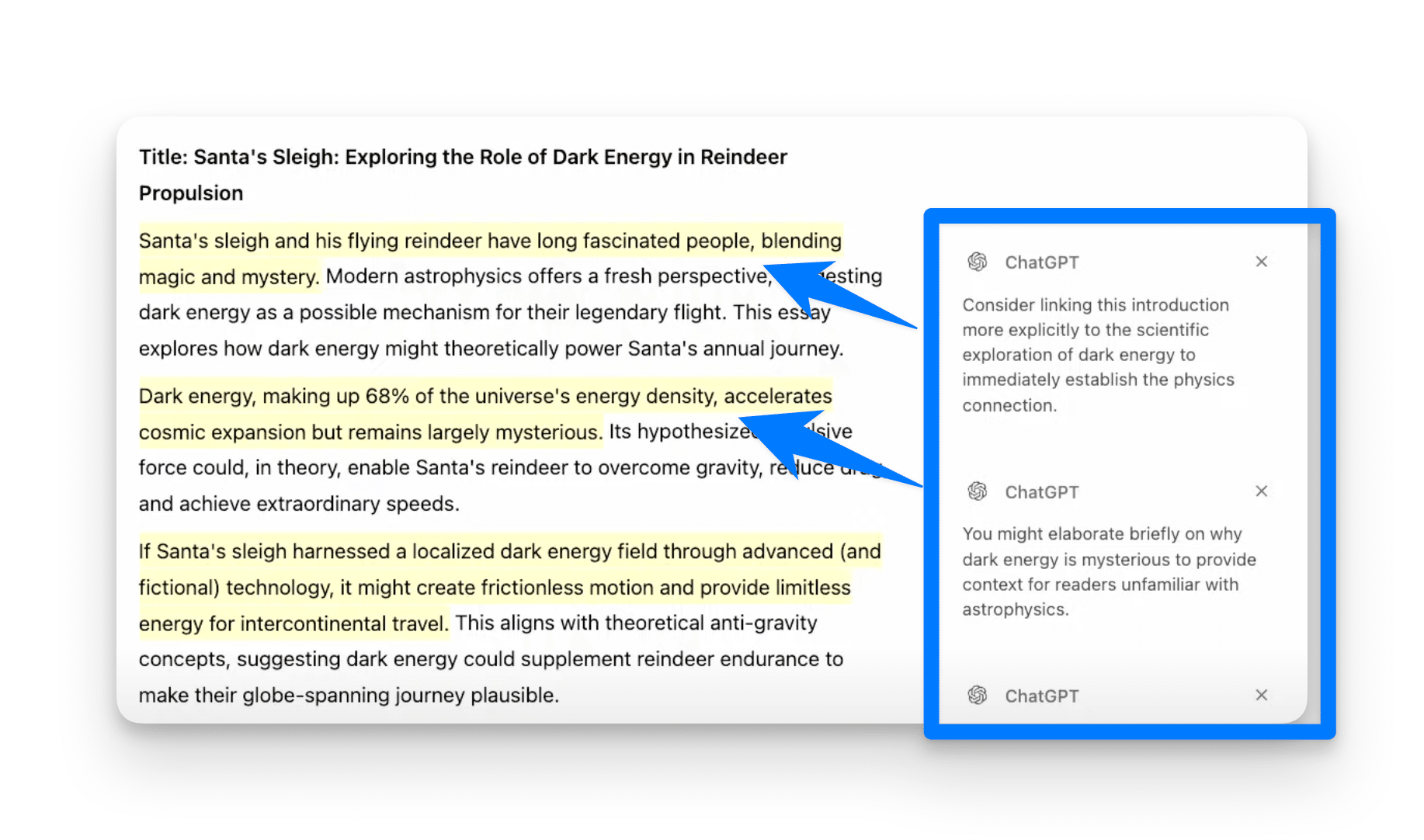 ChatGPTは特定の段落やコード行に対して直接コメントを付与でき、編集ポイントが明確になります。