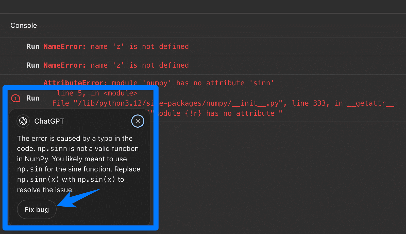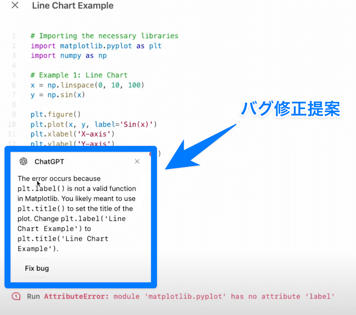 実行結果やエラー発生時には、Canvas上で該当行や関数が即座に特定され、ChatGPTが的確な改善提案やコード修正案を提示してくれます。