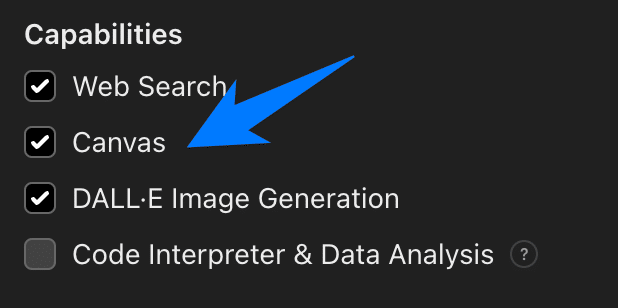 すでに作成済みのカスタムGPT(GPTs)を編集し、設定画面で「Canvasツールを有効化」するチェックボックスをオンにすると、そのGPTはCanvasモードで回答を生成できます。
