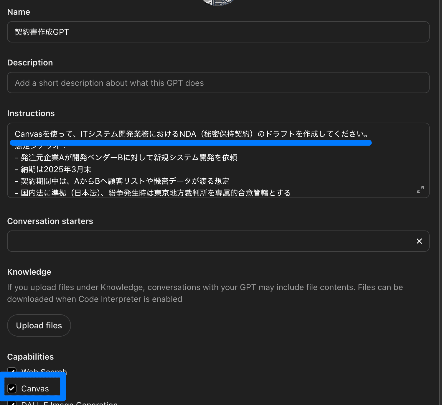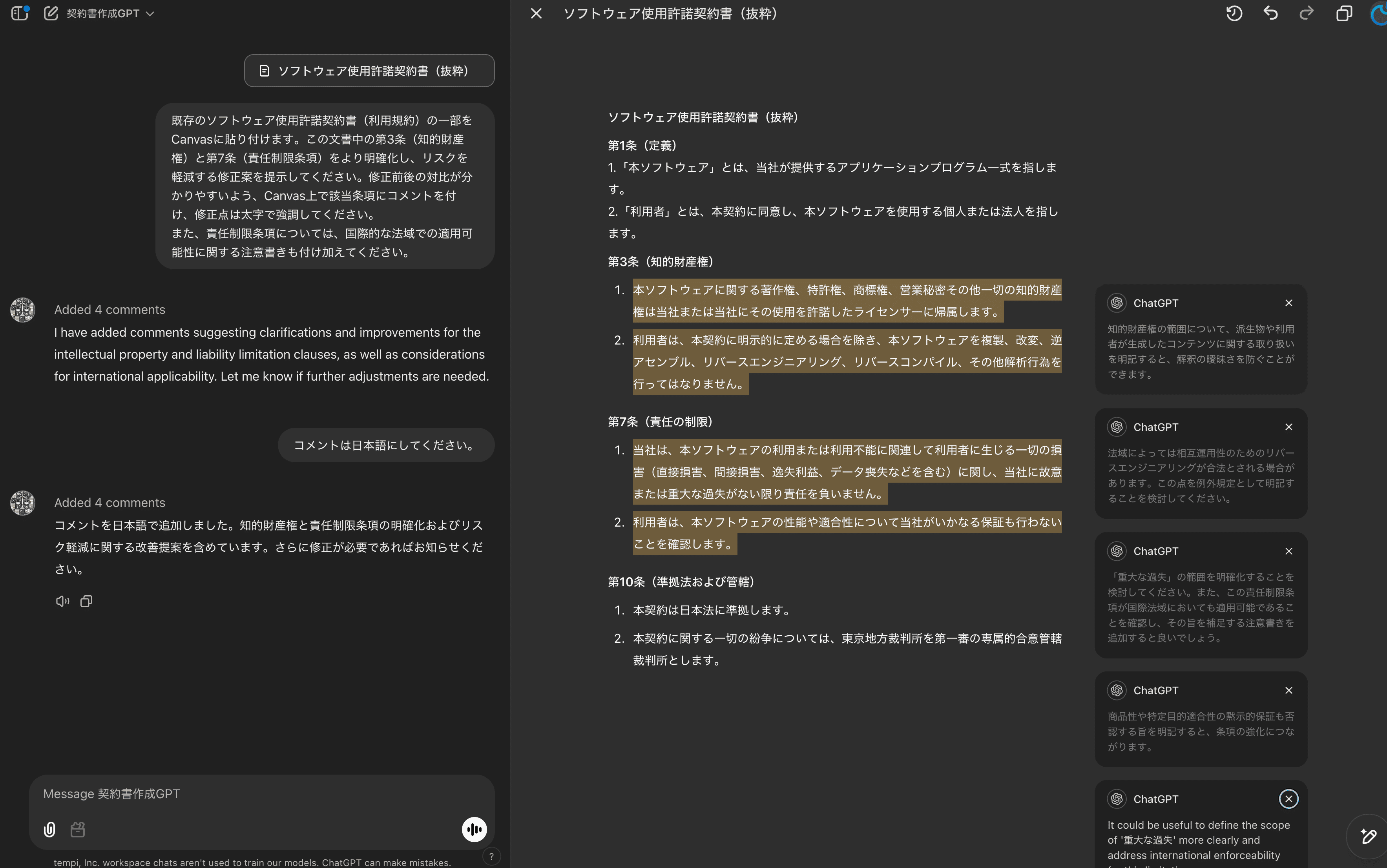 たとえば、法務関連GPTにCanvasを組み込めば、契約書ドラフトを即時に修正・検証することができます。