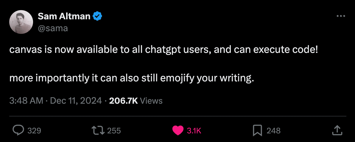 本アップデート(Canvas機能の全ユーザー開放、Canvas内でのPython実行、GPTsへのCanvas搭載)は、2024年12月11日より順次反映されます。