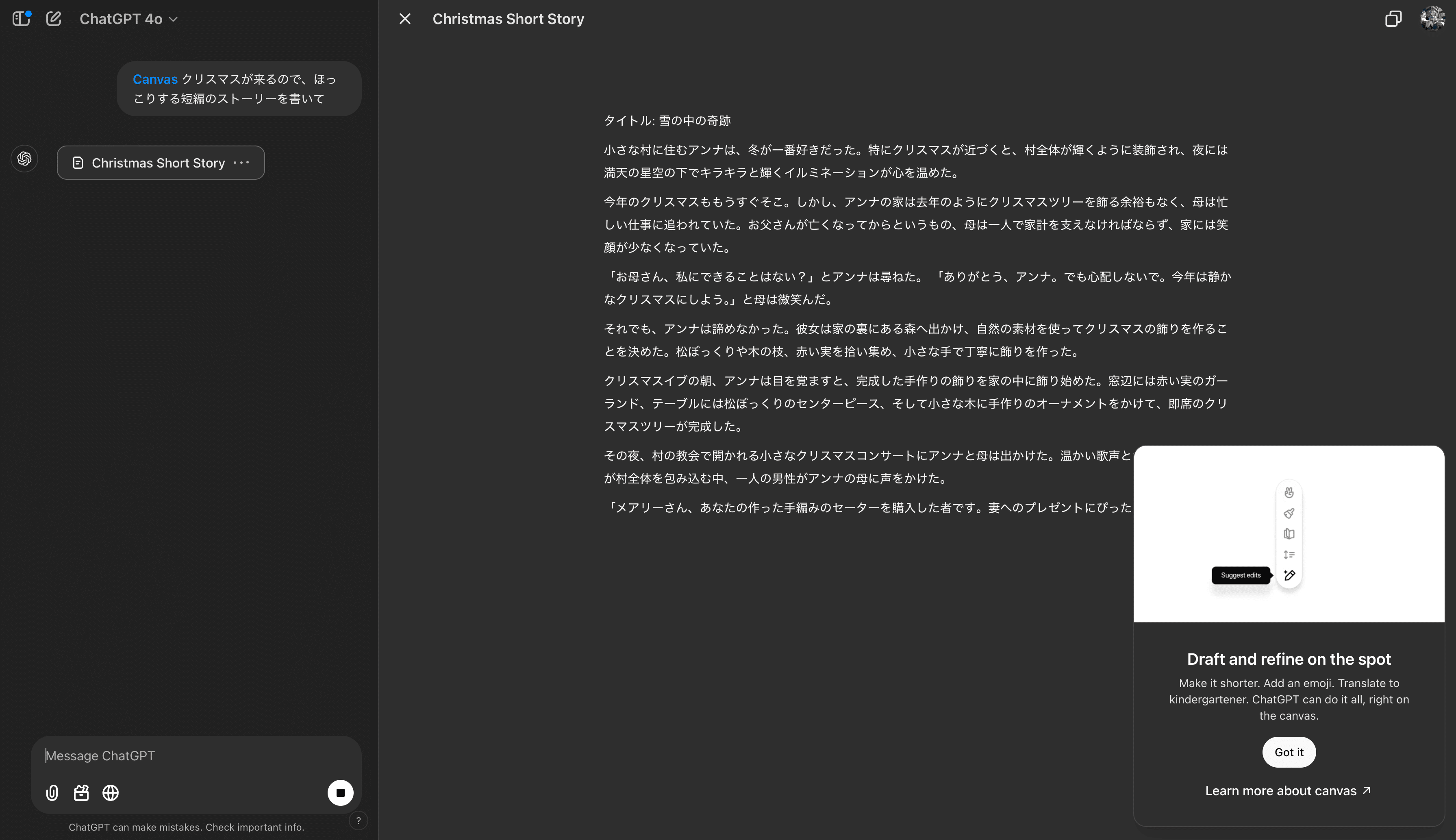 Canvasを使うことで、文章作成からコード執筆まで、あらゆるタスクを1つのUIで完結できます。