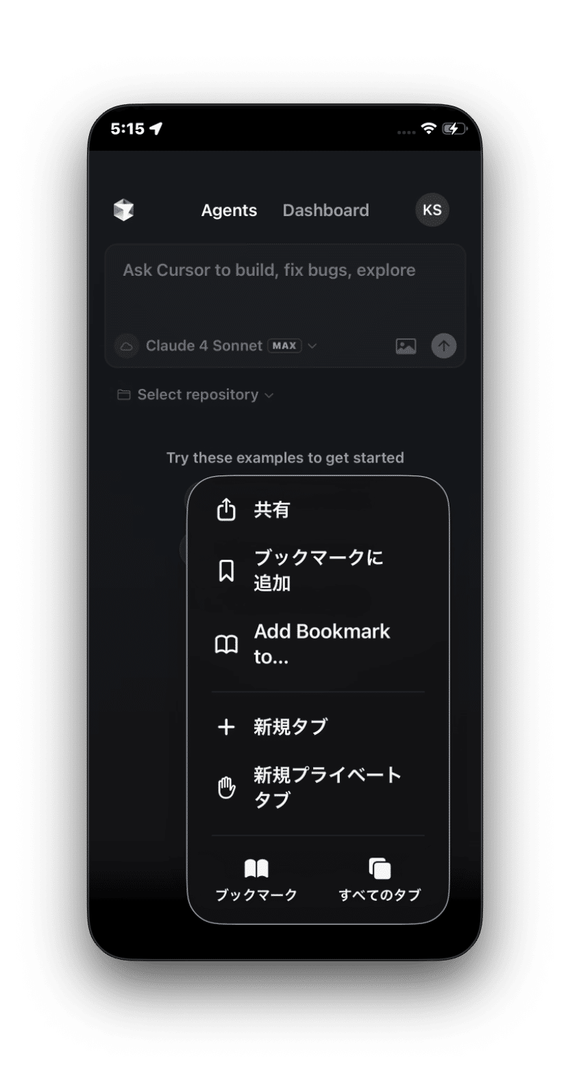 ① Safariで `cursor.com/agents` を開きます。