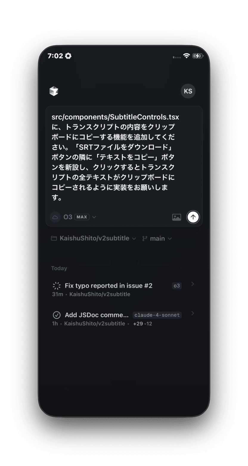 外出先で、既存のUIコンポーネントにちょっとした機能追加を思いついた、という状況を想定して、スマートフォンからエージェントに直接指示してみます。