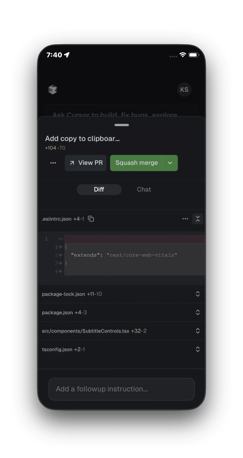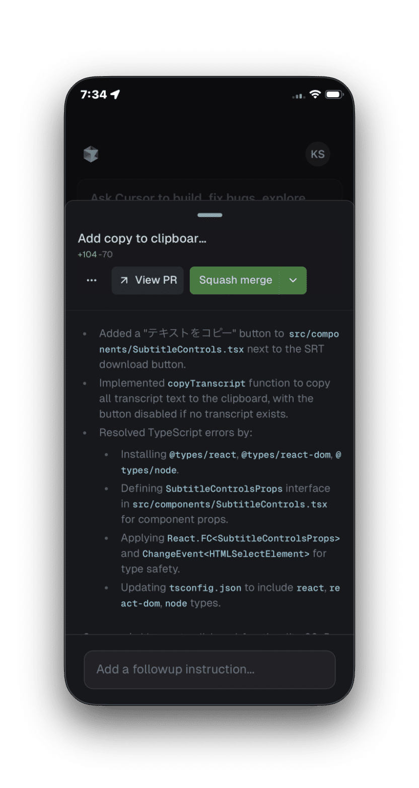移動中などのPCが使えない状況でも、スマートフォンからコーディングタスクを依頼できます。そして修正をデスクトップのCursorにワンクリックで引き継ぐ、という一貫した開発体験が可能になります。