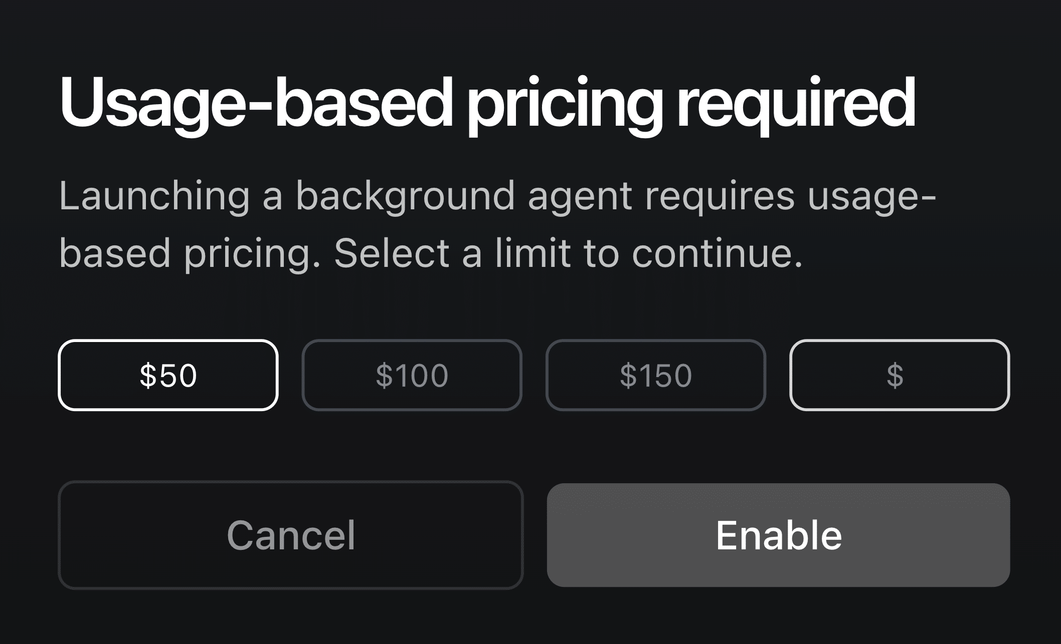 GitHub連携後、「Usage-based pricing required」という画面で上限額の設定を求められます。