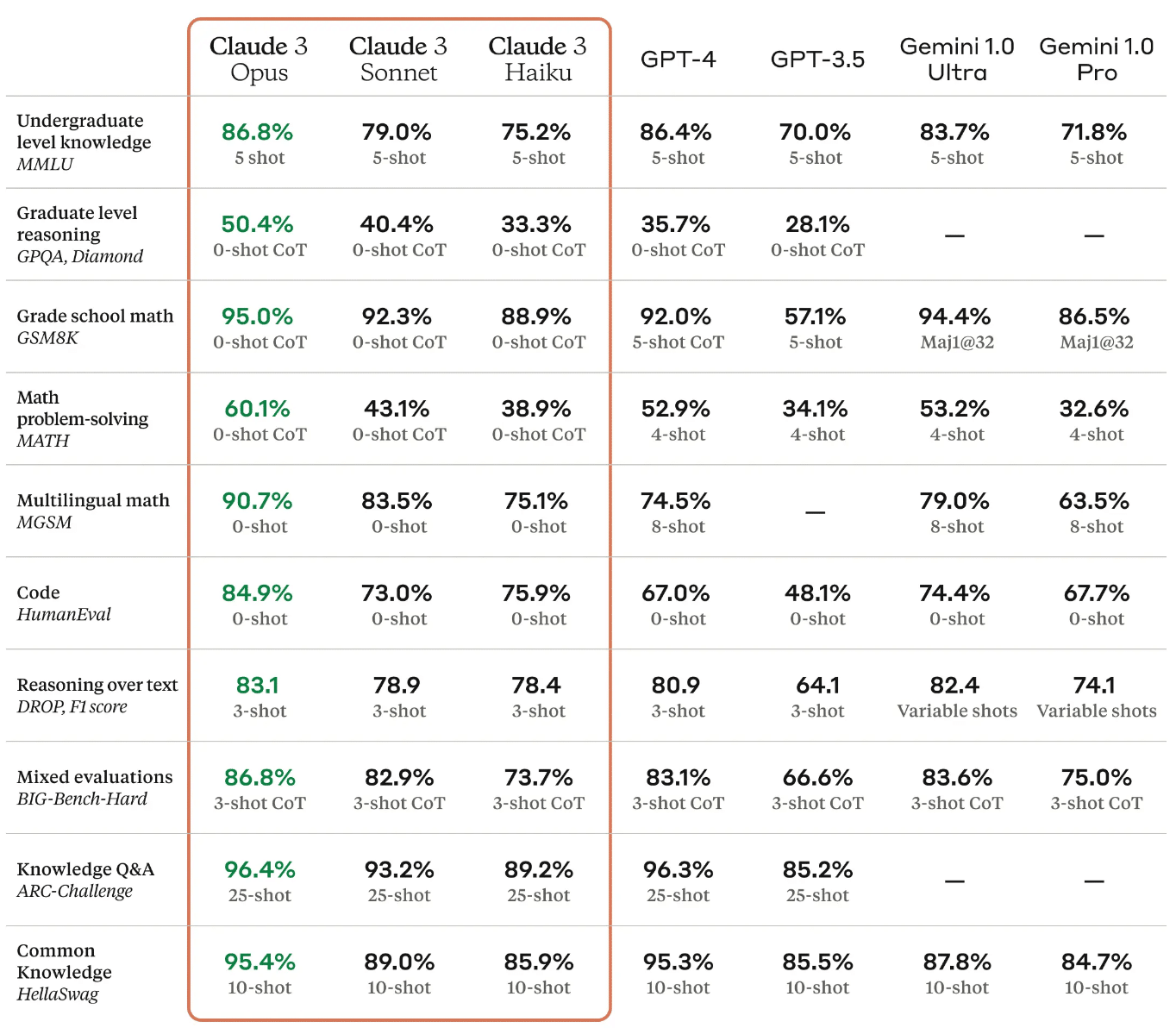 Opusは、GPT-4を含む競合他社の製品と比較して、ほぼ全ての評価で最高得点を記録しています。SonnetとHaikuも同クラスのモデルでトップクラスの性能を示しました。