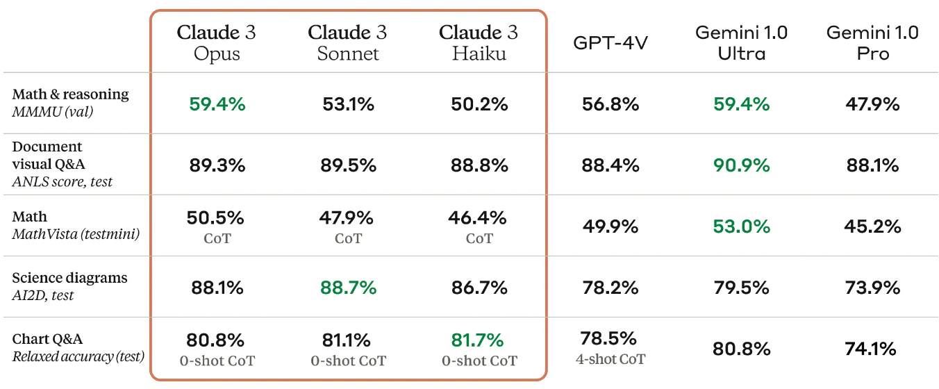 OpusだけでなくSonnetもほとんどの項目で上位に食い込んでおり、従来モデルを上回る性能を持つことがわかります。Haikuも同クラスのモデルの中では最高速かつ最も低コストで、同等以上の性能を発揮しています。