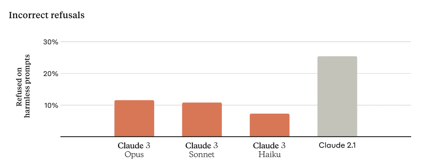 下の図が示すように、Claude 3は微妙なニュアンスを汲み取り、実際に危害のない要求まで拒否することはほとんどなくなりました。