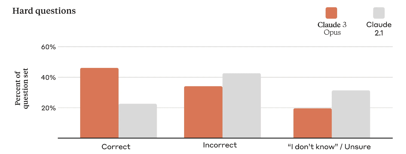 ビジネスにおいてスケールする上で、モデルの高い正確性は不可欠です。Claude 3 Opusは、既知の弱点を突く難問に対し、誤答や不確実な回答を大幅に減らしつつ、正答率を2倍に改善しました。