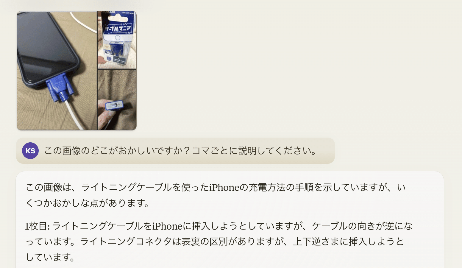この画像は、ライトニングケーブルを使ったiPhoneの充電方法の手順を示していますが、いくつかおかしな点があります。