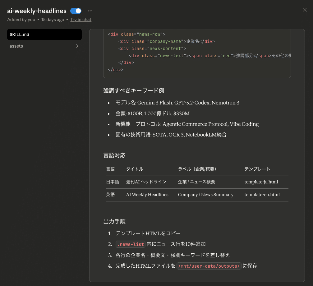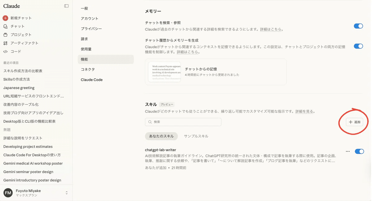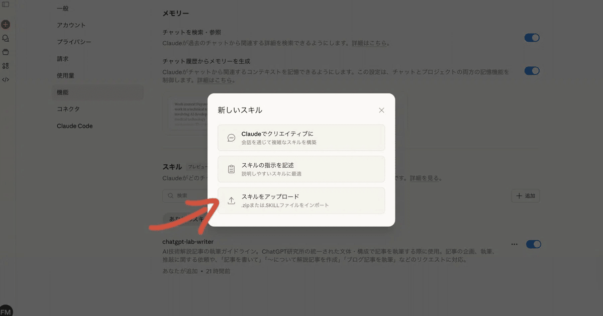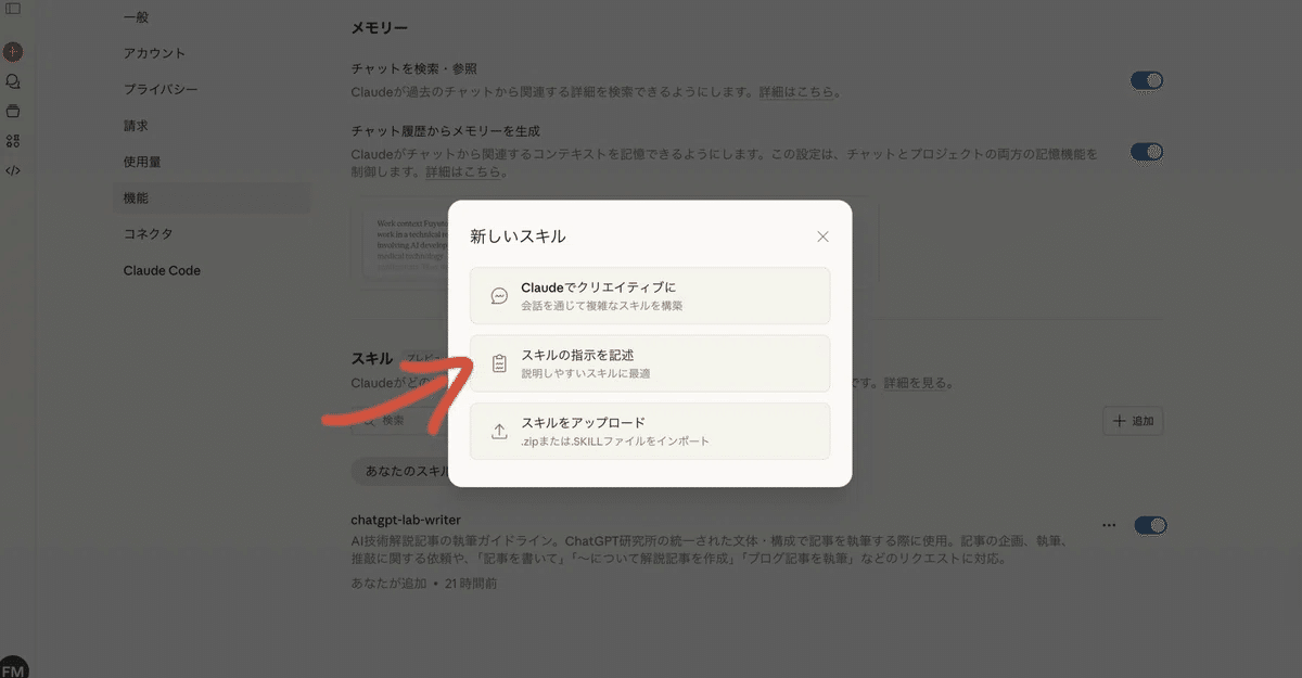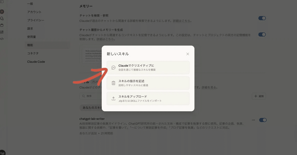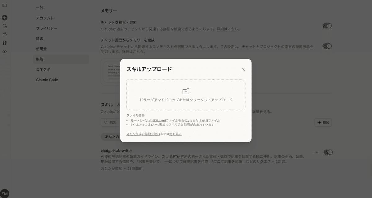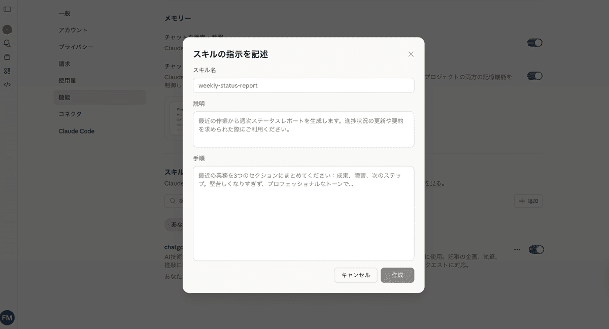 Claudeがワークフローを理解し、適切なSKILL.mdを自動生成します。(”機能”タブを経由しなくても直接対話UIからSkills作成の指示も可能)