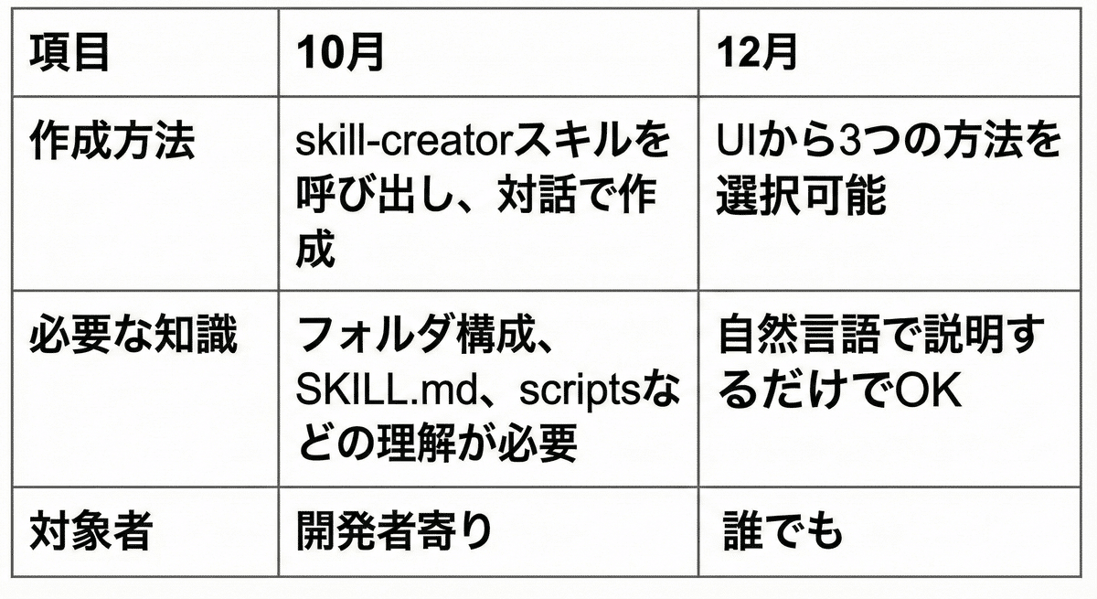 10月のリリース時点では、Skillを作るには「開発者寄り」のフローが必要でした。12月のアップデートで、非エンジニアでも簡単にSkillを作れるようになりました。