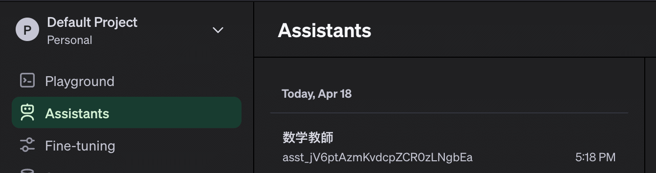 なお、上記のコードを実行すると、以下の、Assistants専用のOpenAI のコンソール上に、Assistantsが作成されます。