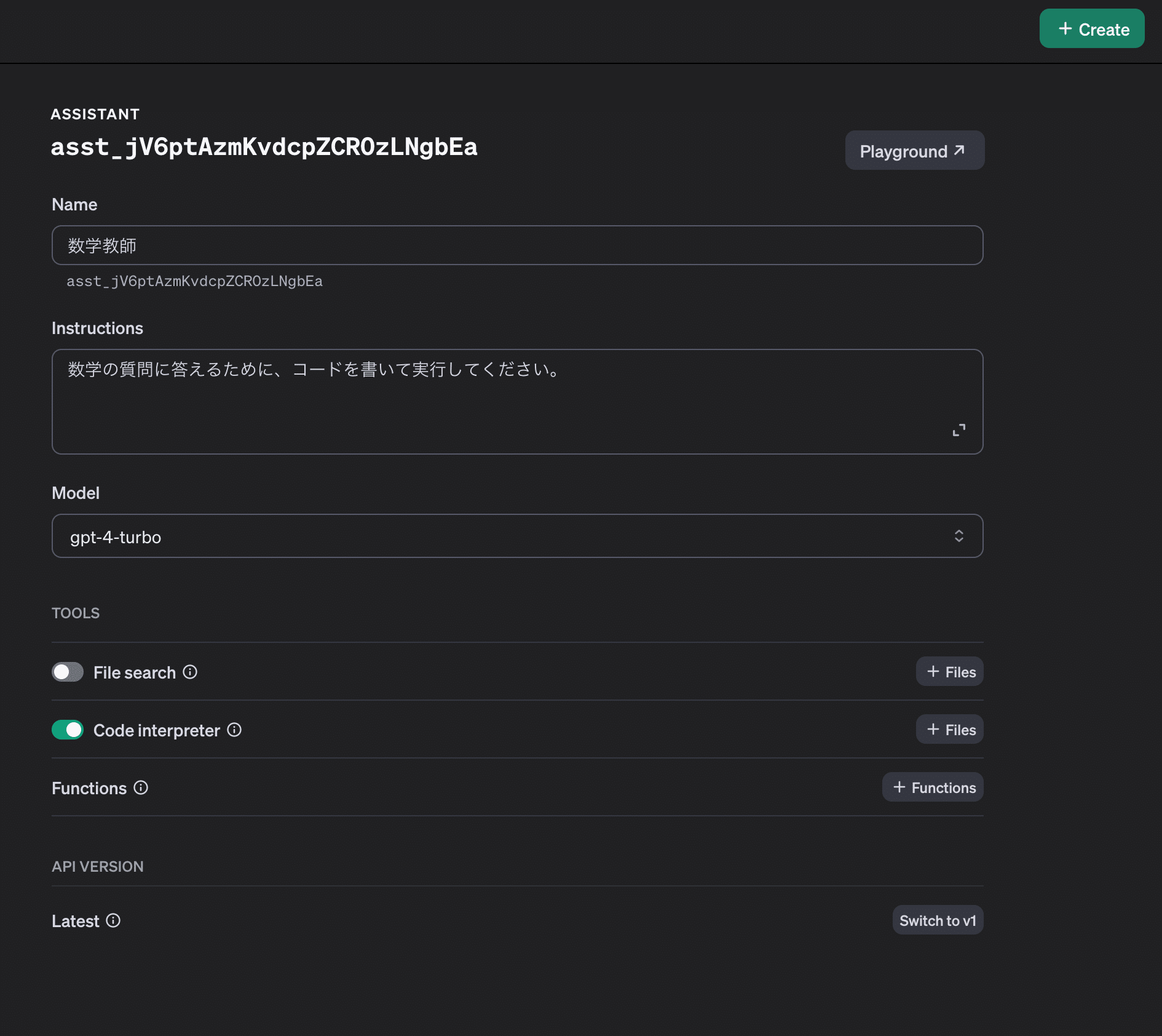 この例では、Code Interpreterツールが有効になっている個人的な数学チューターであるアシスタントを作成します。