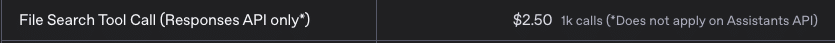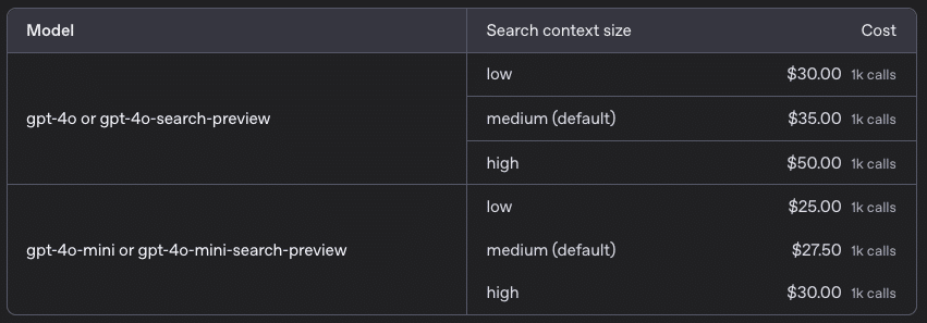 Web Search:1,000クエリあたり30ドル~(GPT-4o)/25ドル~(GPT-4o-mini)