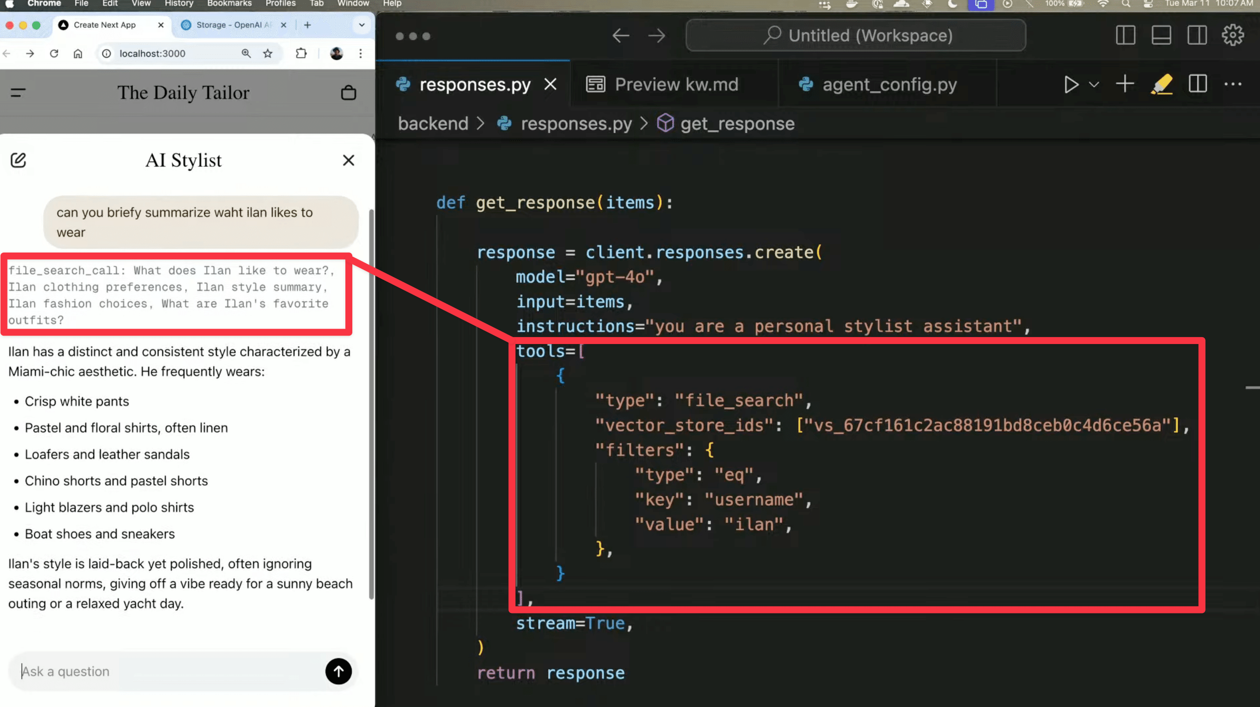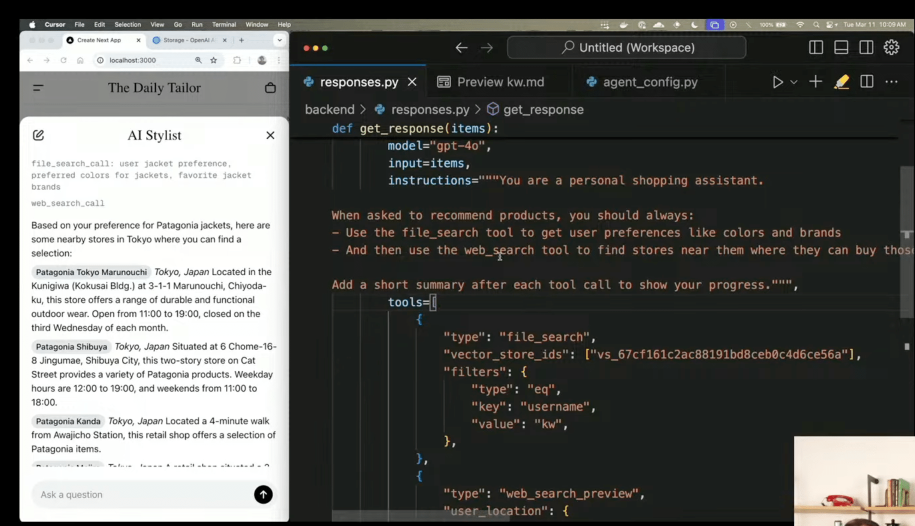 ライブ発表では、複数ツールとResponses APIを組み合わせたエージェントの実装例が紹介されました。個人向けのスタイリング支援エージェントでは、File Searchでユーザー情報を参照しながらWeb Searchで周辺店舗を探し、最適なコーディネートを提案。