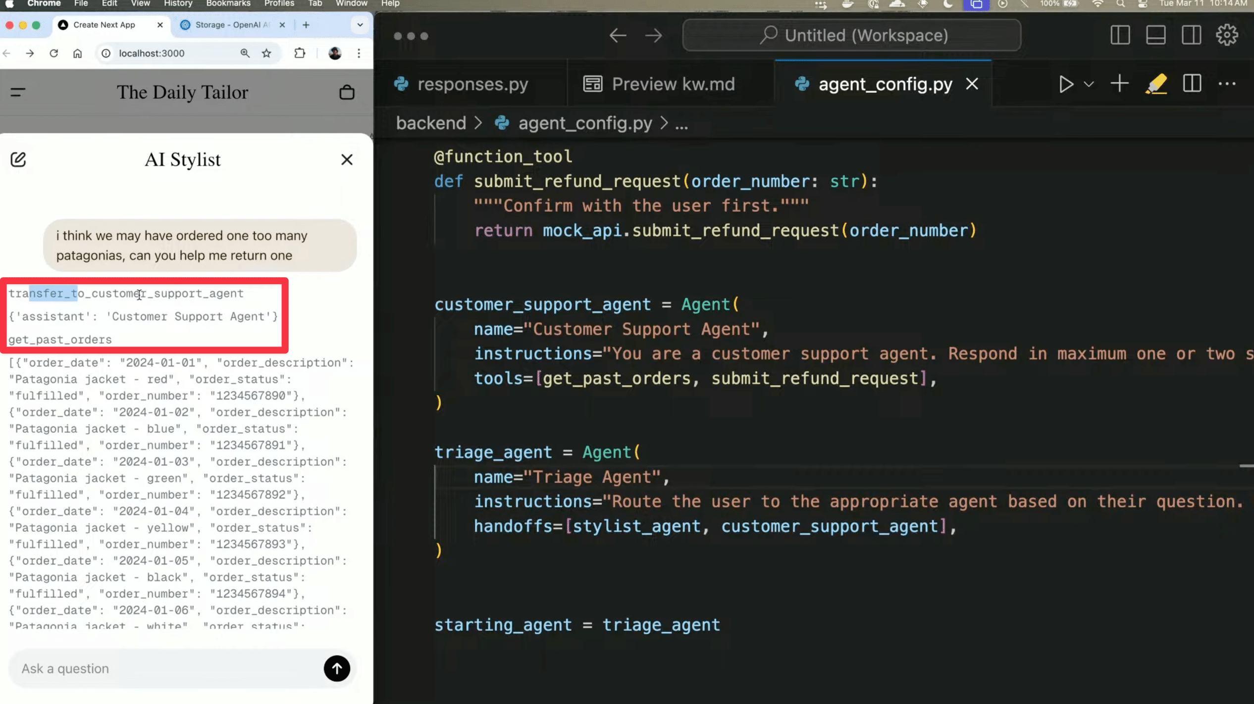 顧客サポートエージェントの例では、複数の専用エージェントをハンドオフで切り替え、注文情報の確認から返金処理までを自動化していました。