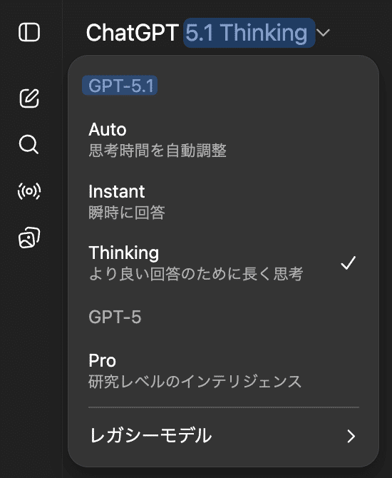 Auto / Instant / Thinking の三本柱に統一し、GPT-5系列全体を5.1に揃えてきた点も、その流れの一環と捉えられます。