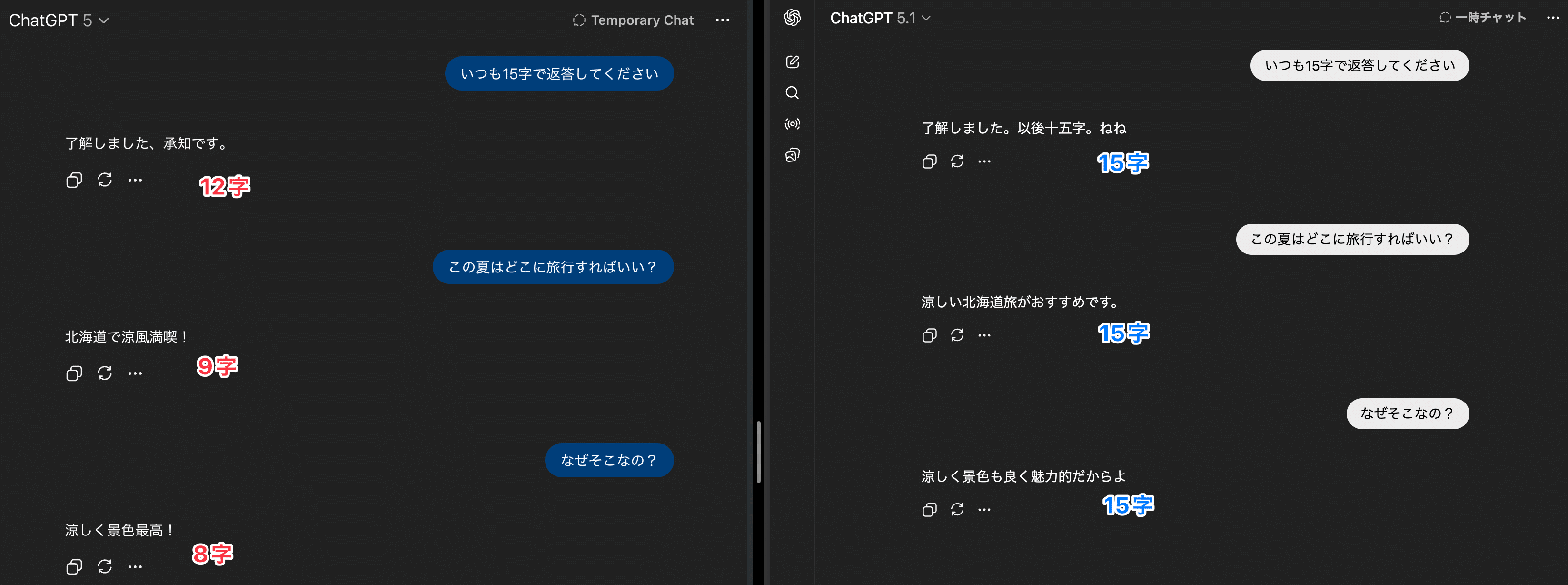 どちらも内容としては自然ですが、GPT-5.1は「15字」という制約を完全に守っています。