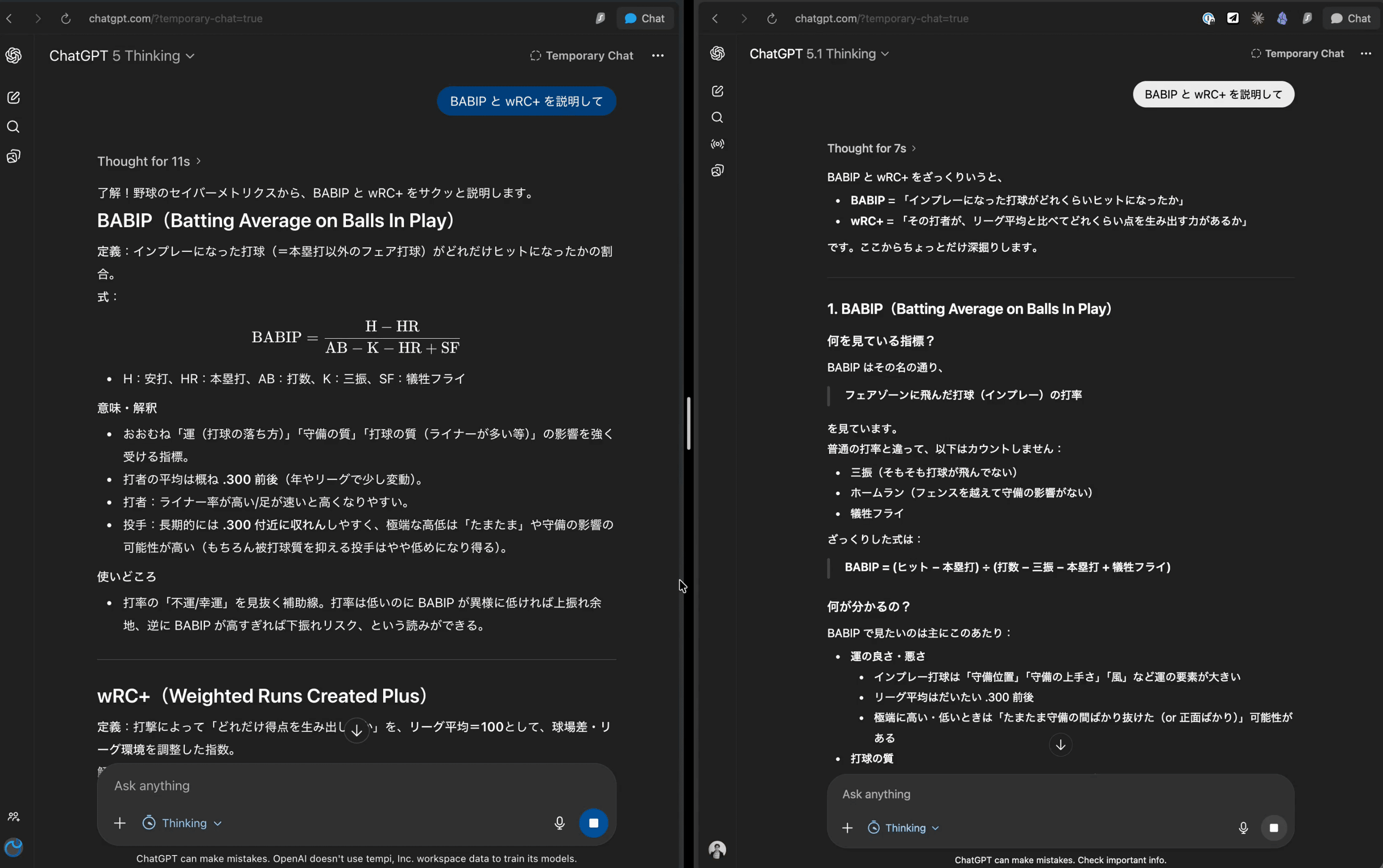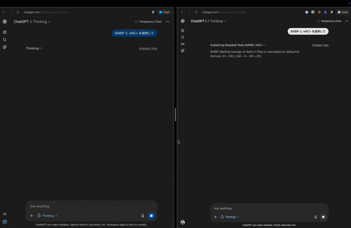 実際に、野球の指標を題材にGPT-5 ThinkingとGPT-5.1 Thinkingを比較しました。