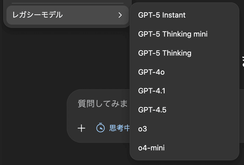 GPT-5(Instant / Thinking / Pro)は、モデルピッカーの「Legacy models」配下に3か月間だけ残ります。