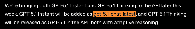 API上では、Instant が gpt-5.1-chat-latest、Thinking が gpt-5.1 として追加され、どちらも ChatGPT 同様に adaptive reasoning 対応になります。