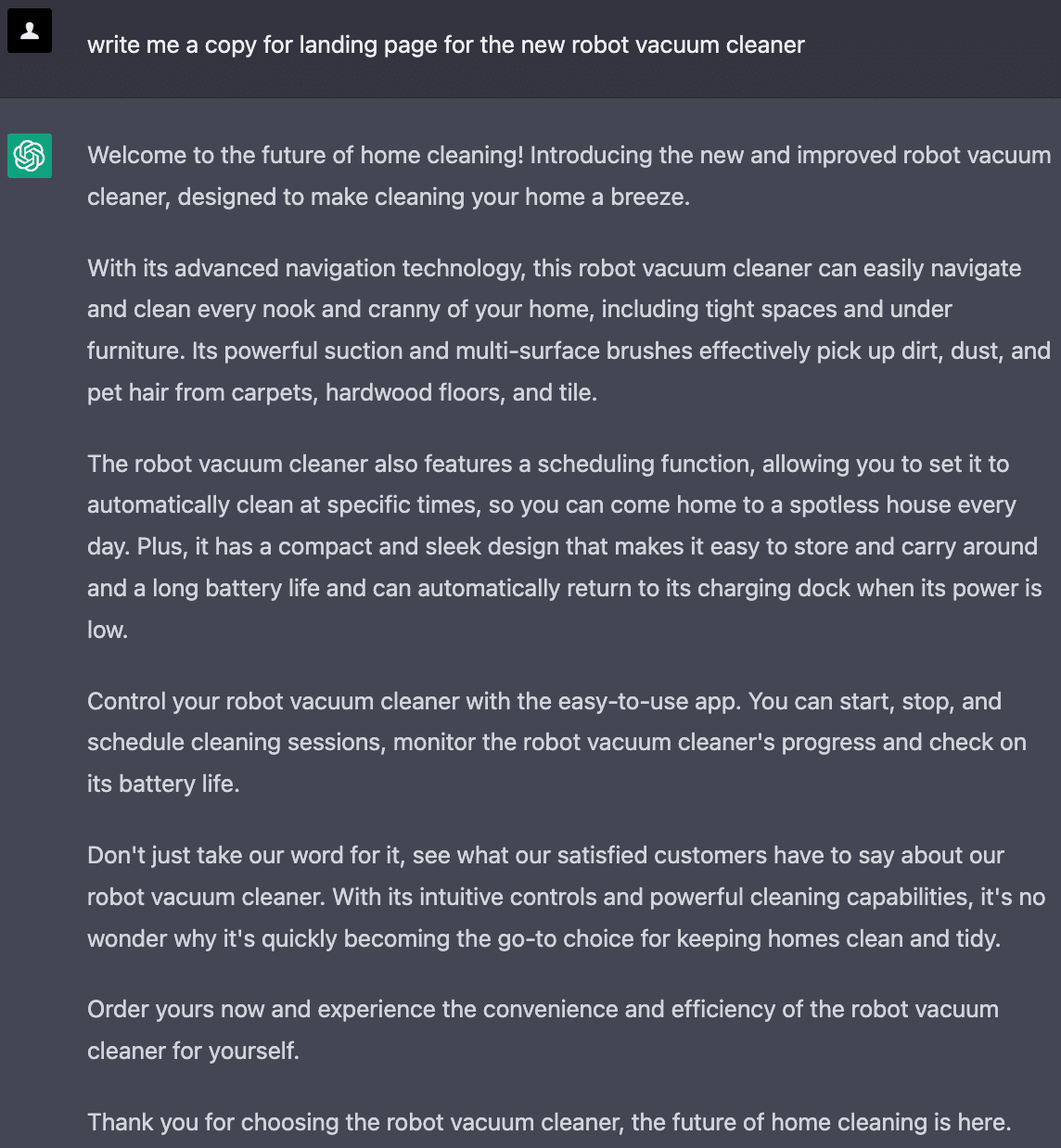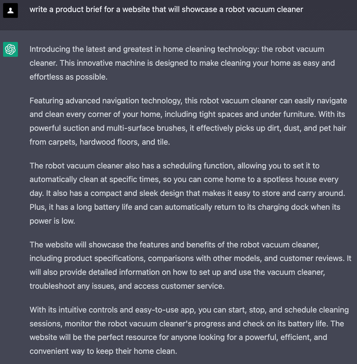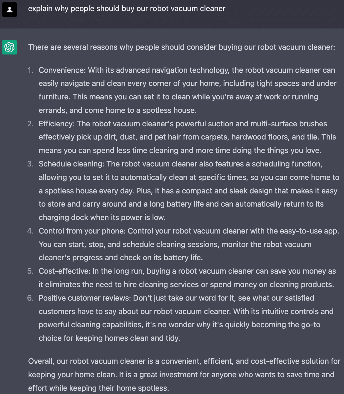 「消費者が私たちのロボット掃除機を買うべき理由を説明してください」というプロンプトを与えると、ChatGPTはこの掃除機を持つことで得られるメリットをリストアップしました。しかし、このリストにはいくつか問題がありました。はっきり言えるのは、クリエイティブ性がないことです。(他の製品に対しての具体的な利点が示されていない)。他にも、製品説明ですでに言及されていることを繰り返しているというような点もあります。