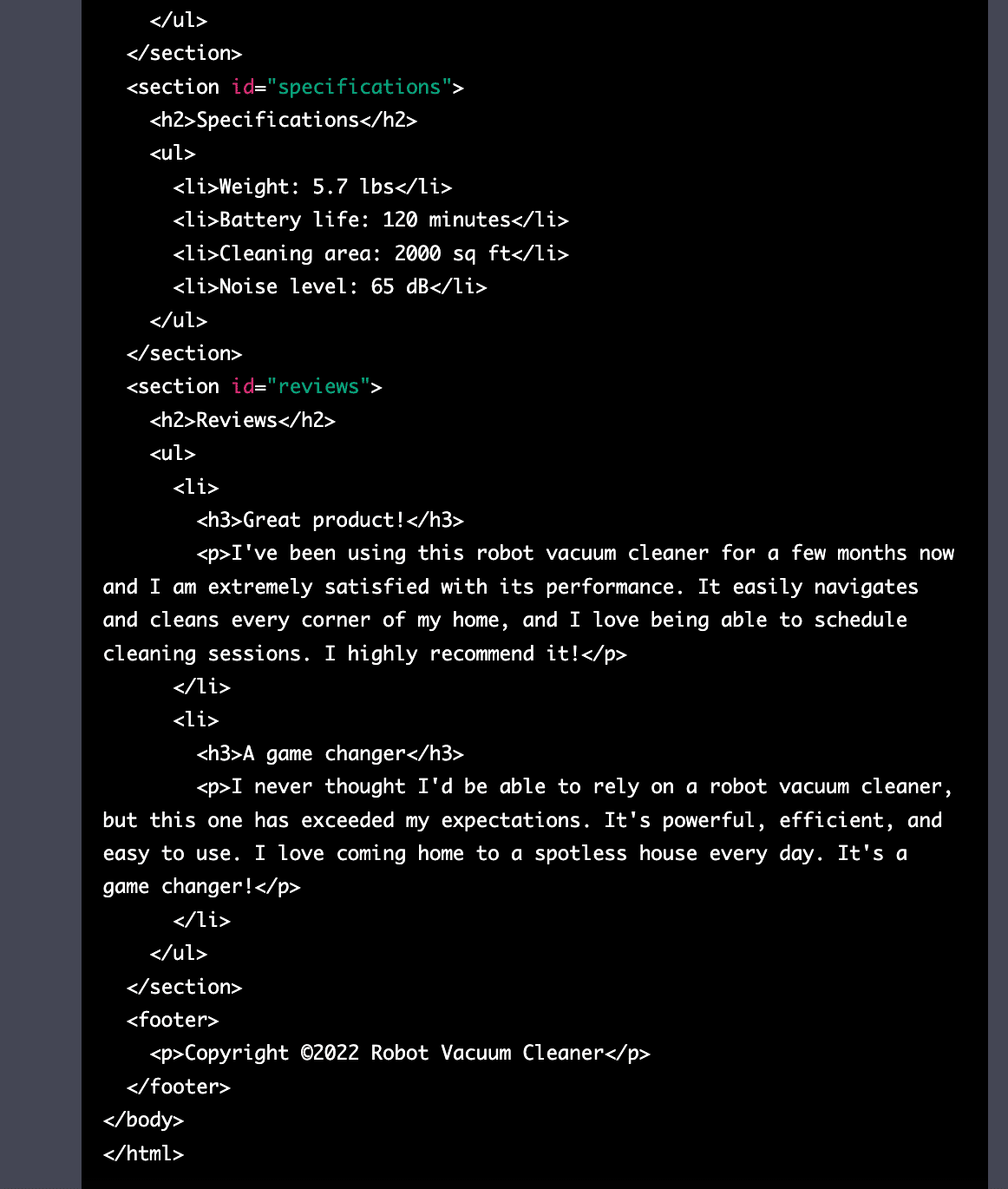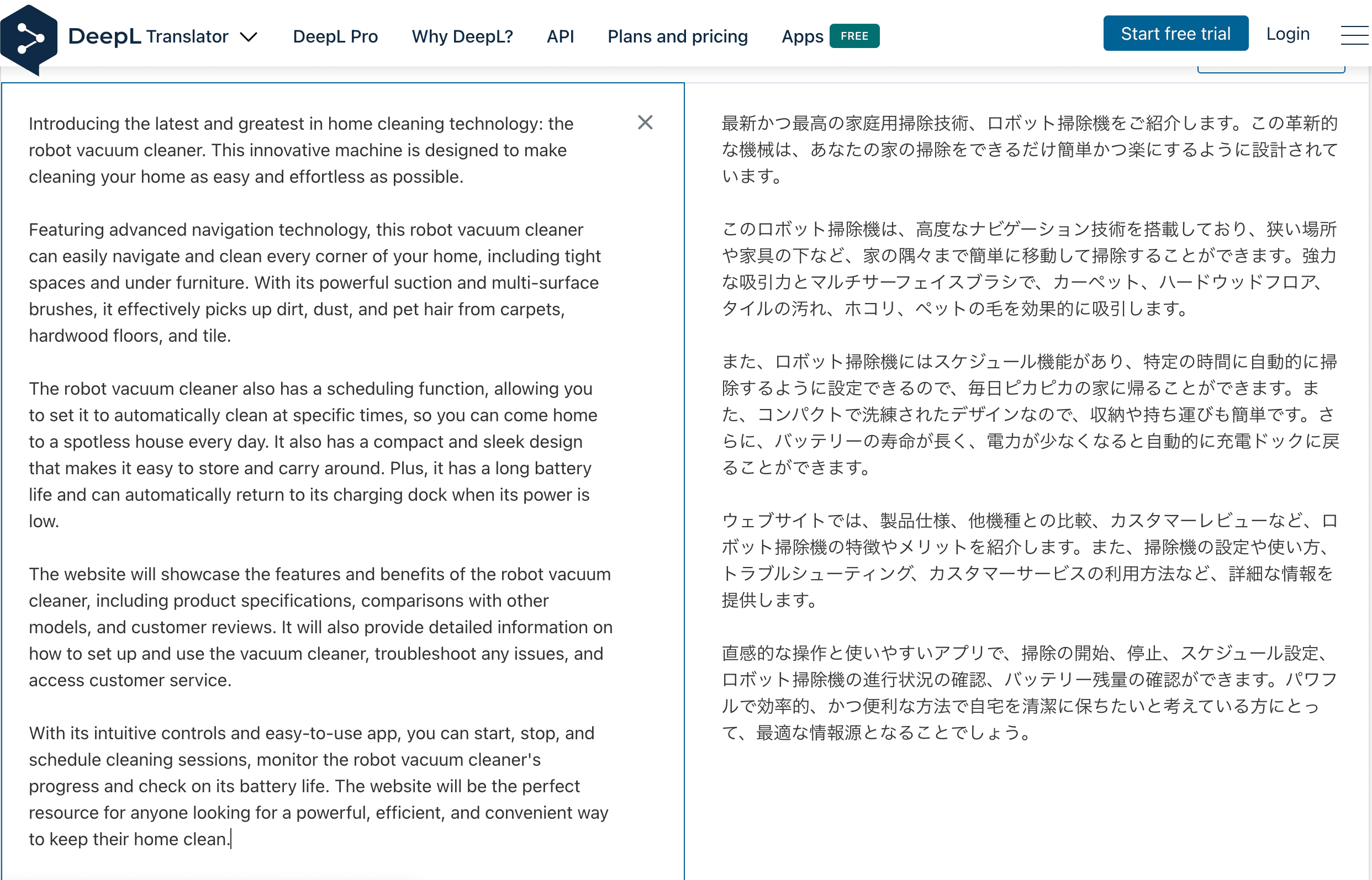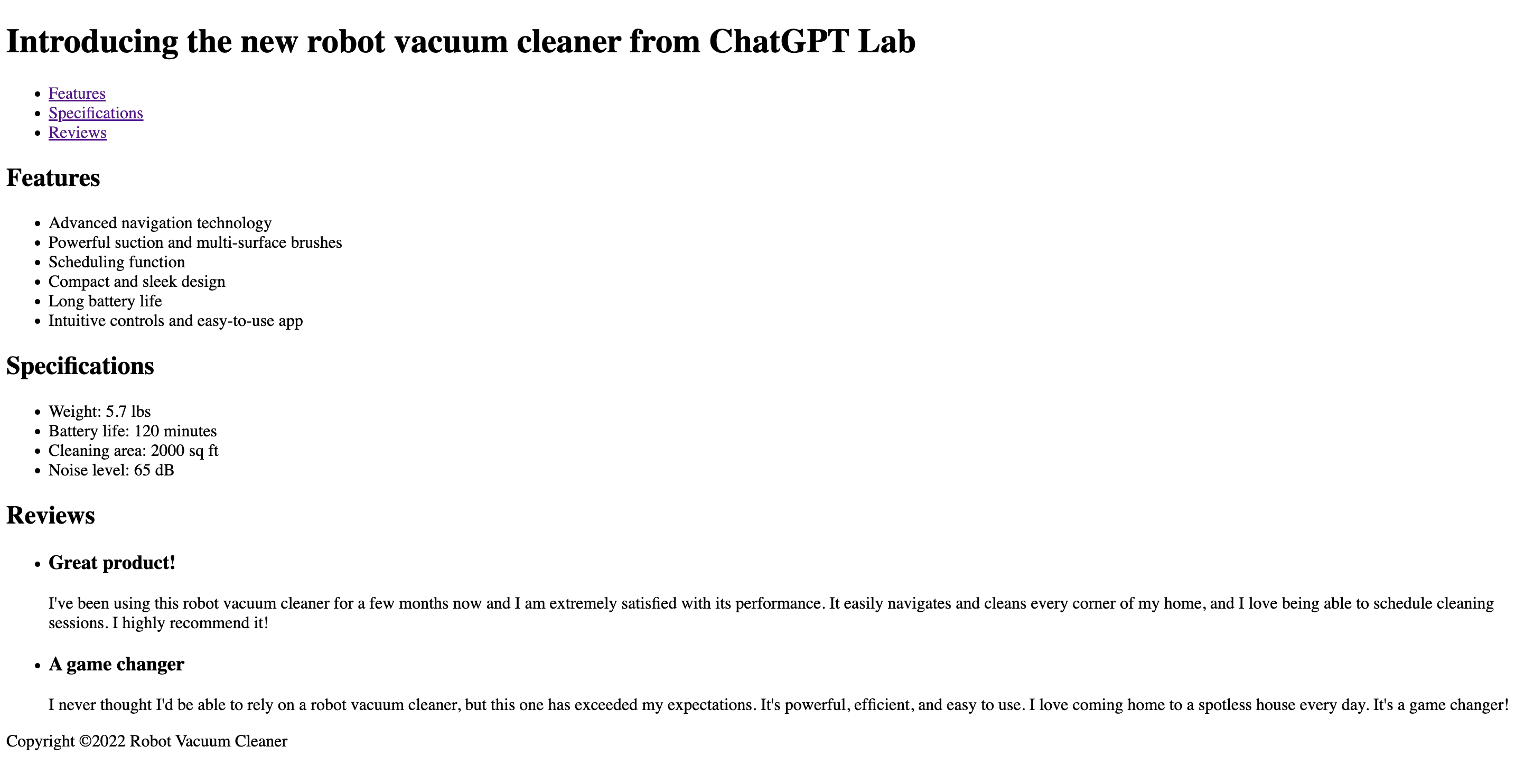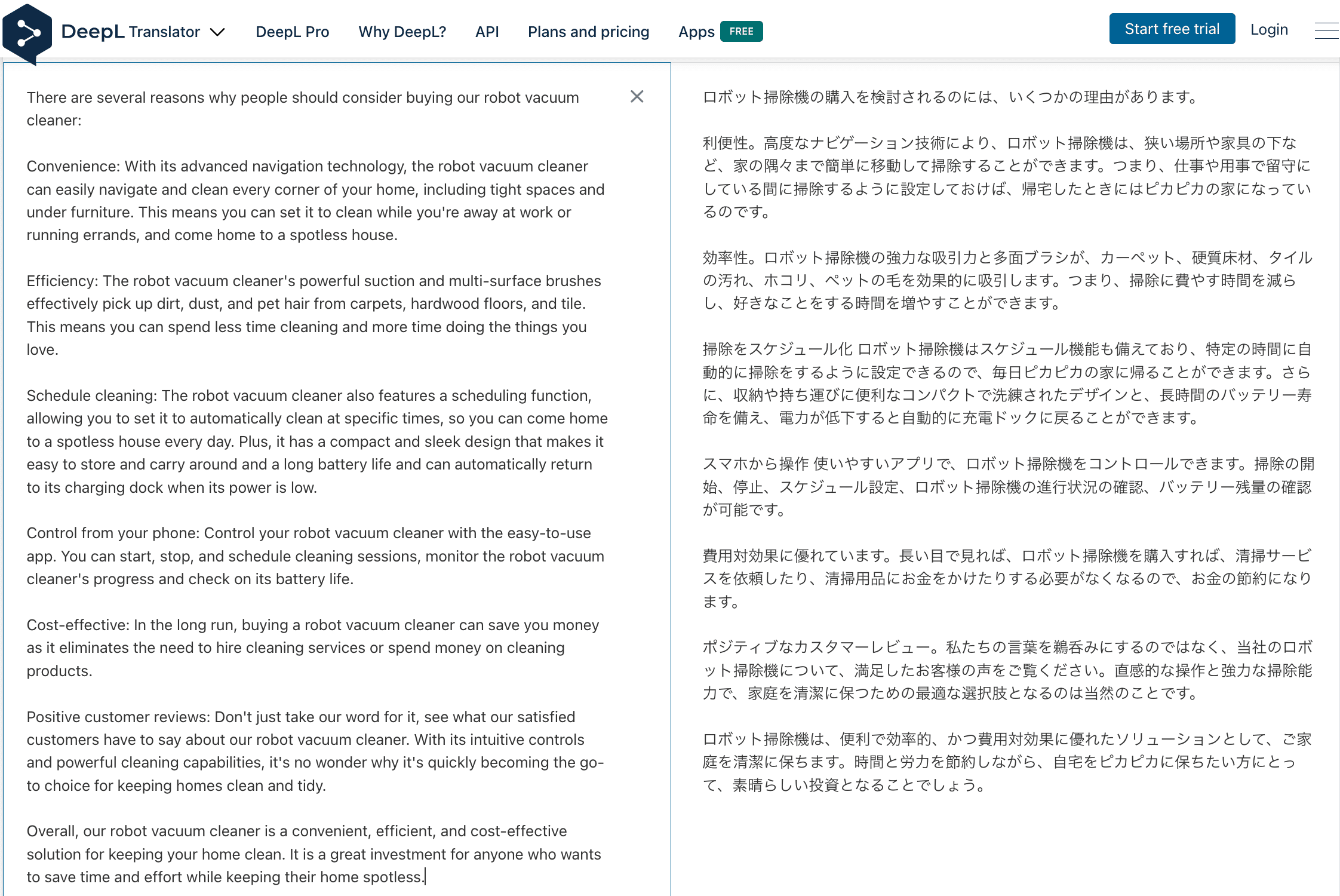 「消費者が私たちのロボット掃除機を買うべき理由を説明してください」というプロンプトを与えると、ChatGPTはこの掃除機を持つことで得られるメリットをリストアップしました。しかし、このリストにはいくつか問題がありました。はっきり言えるのは、クリエイティブ性がないことです。(他の製品に対しての具体的な利点が示されていない)。他にも、製品説明ですでに言及されていることを繰り返しているというような点もあります。