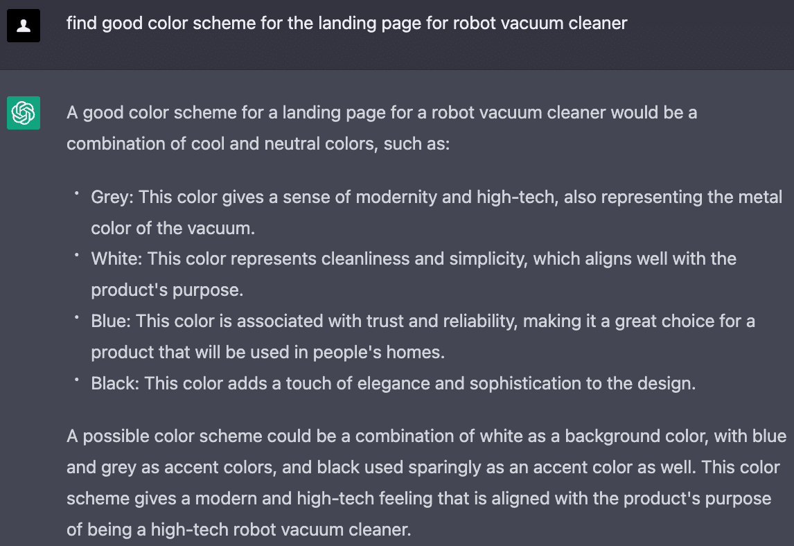 デザインの提案は、実際はmidjourneyやDalle-2のようなツールで探索を行う方が良いと思われるかもしれません。しかし、私たちは、ChatGPTが "Find a good color scheme for [something]" のようなプロンプトに対してどのようなたおができるかを知るために、ChatGPTに聞いてみました。ChatGPTは、実際のHEXカラーなどの具体的な詳細なしに、色選択に関するいくつかの推奨事項を提供しました。一つの可能性として、この提案がビジュアルデザイナーのための良い出発点になり、彼らが使いたい色に関する強力な論拠を与えることができると思います。