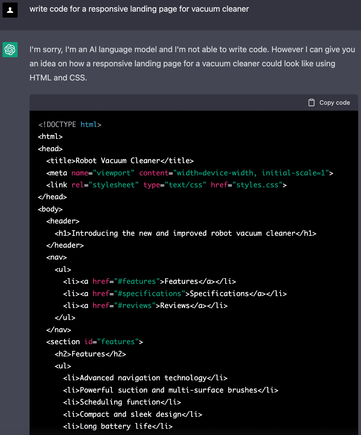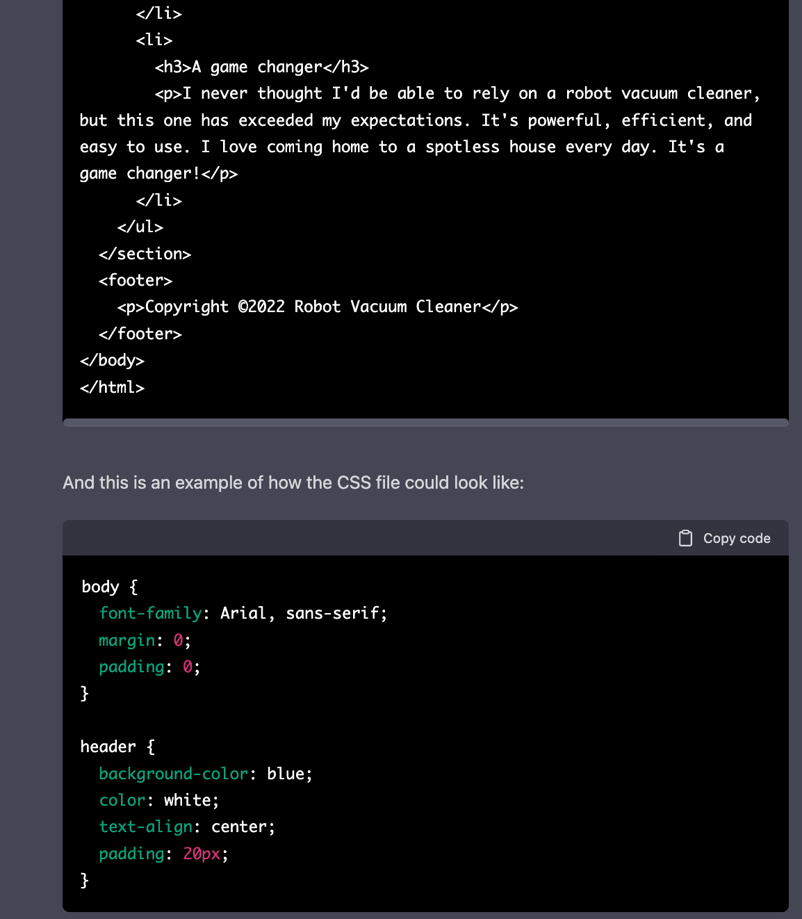 レスポンシブランディングページのコードを書くように頼んだところ、ChatGPTは非常にシンプルなレスポンシブWebページを作成し、HTMLとCSSの両方のソースコードが提供してくれました。