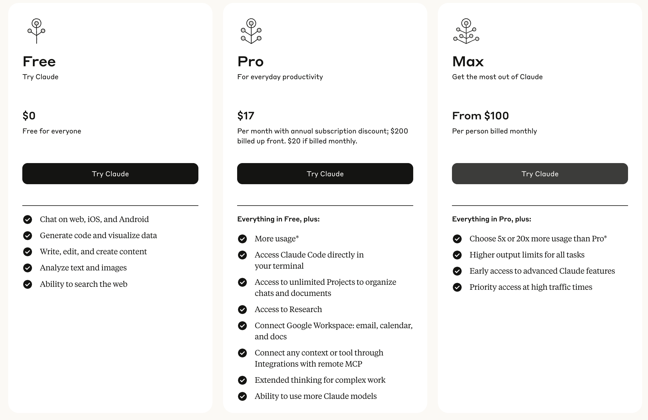 月20ドル(年払いで月17ドル)。メッセージ上限が増え、プロジェクト無制限・Claude Code・Researchモード・Google連携などが解放されます。上位モデル Opusも利用可能。Max