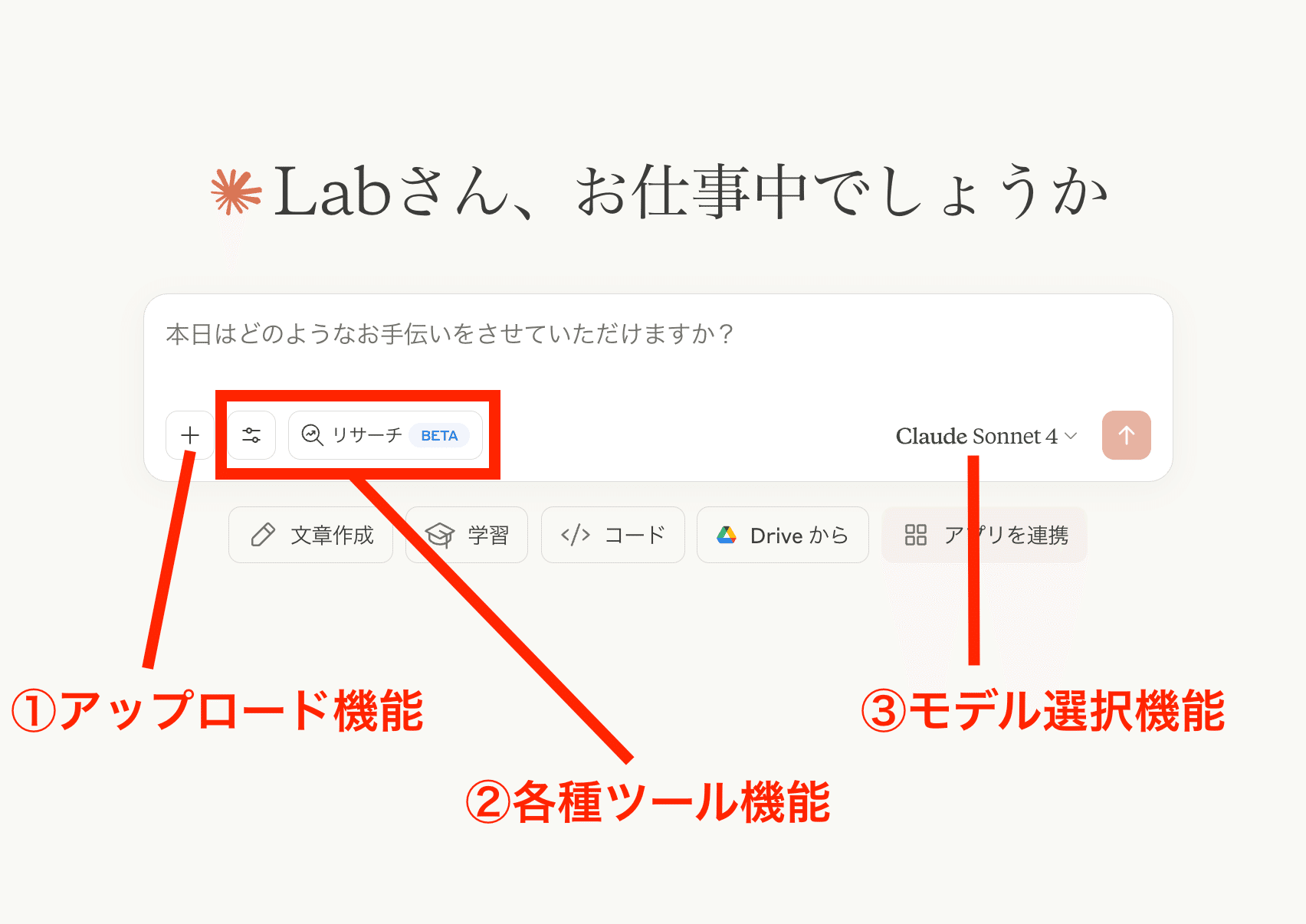 チャット画面は主に、①アップロード機能、②各種ツール機能、③モデル選択機能が表示されています。