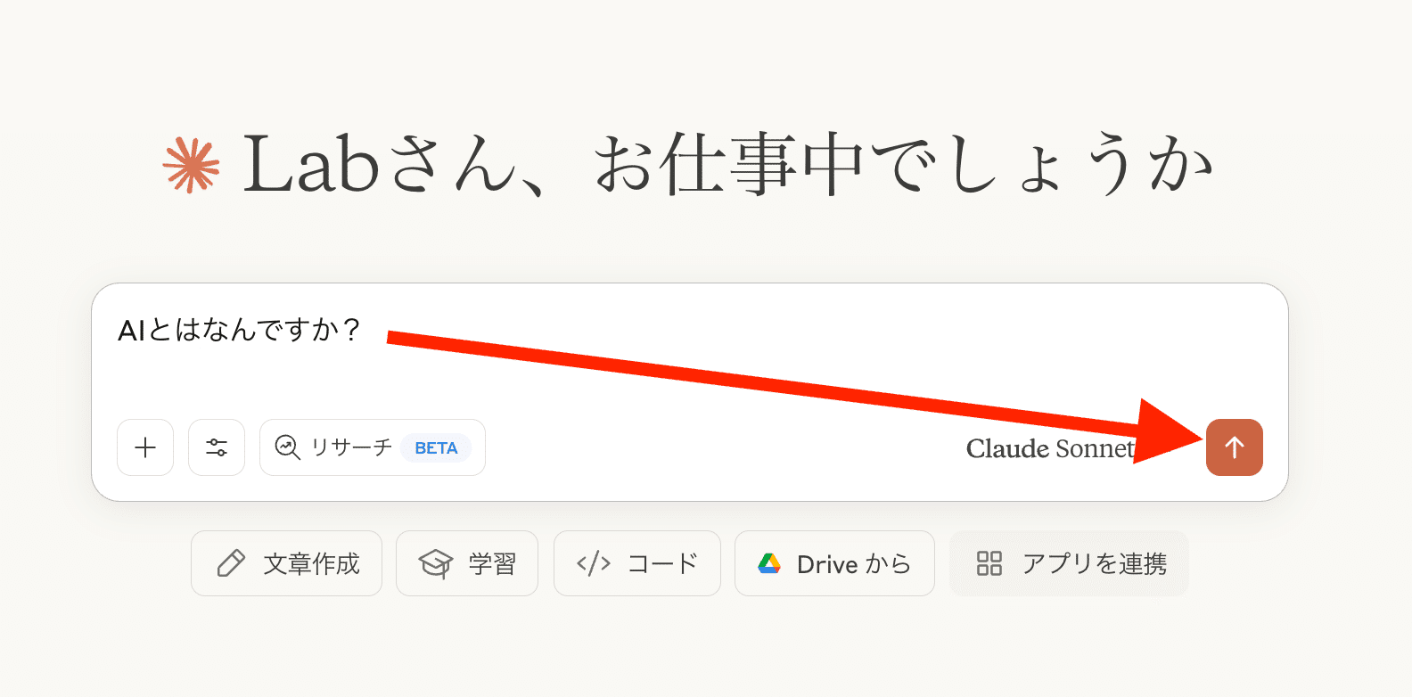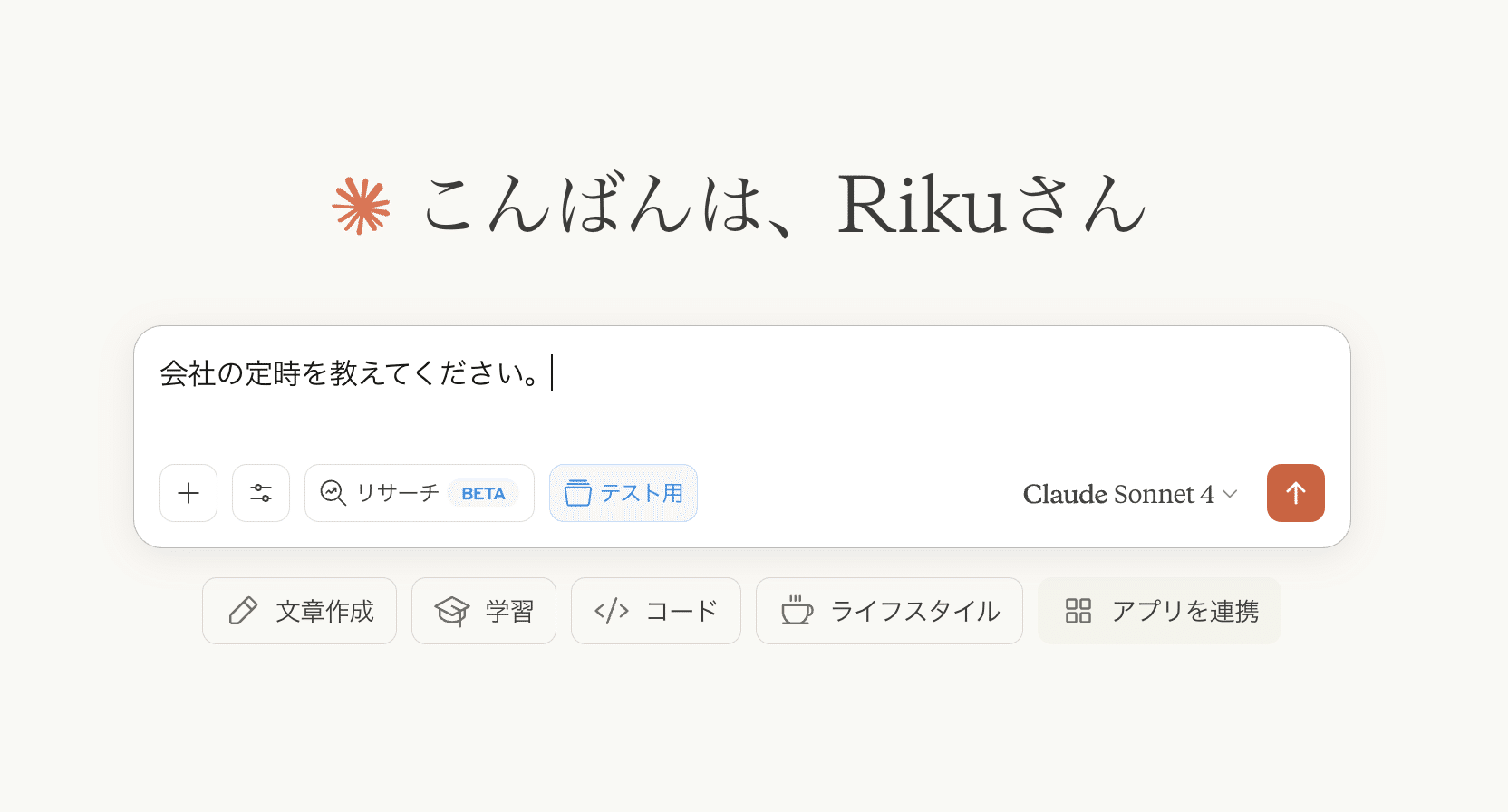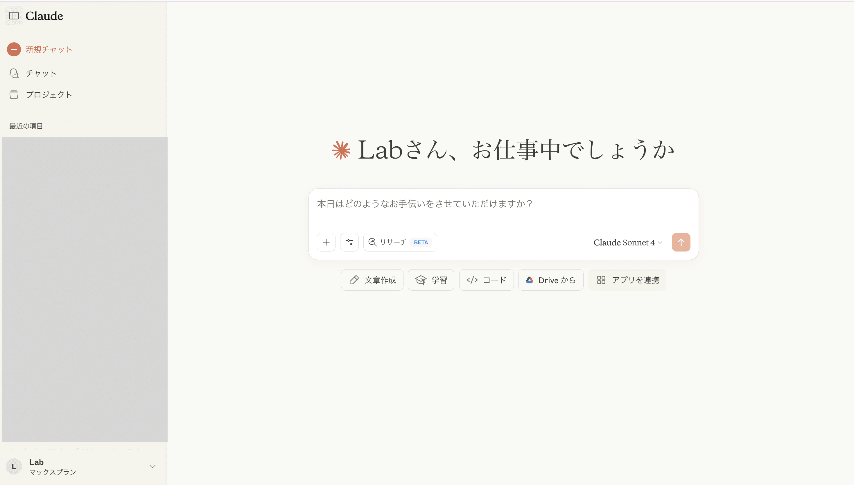 Claudeウェブアプリにログインすると、下記のようなチャット画面が表示されます。