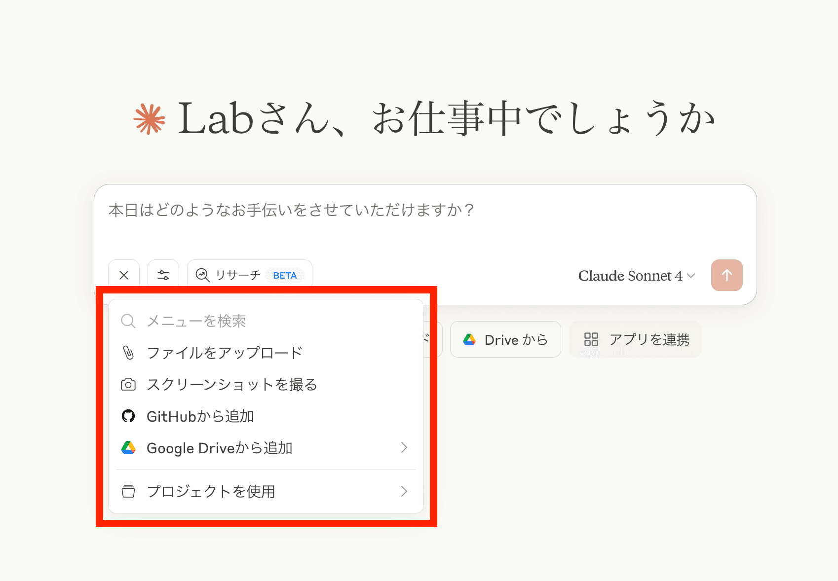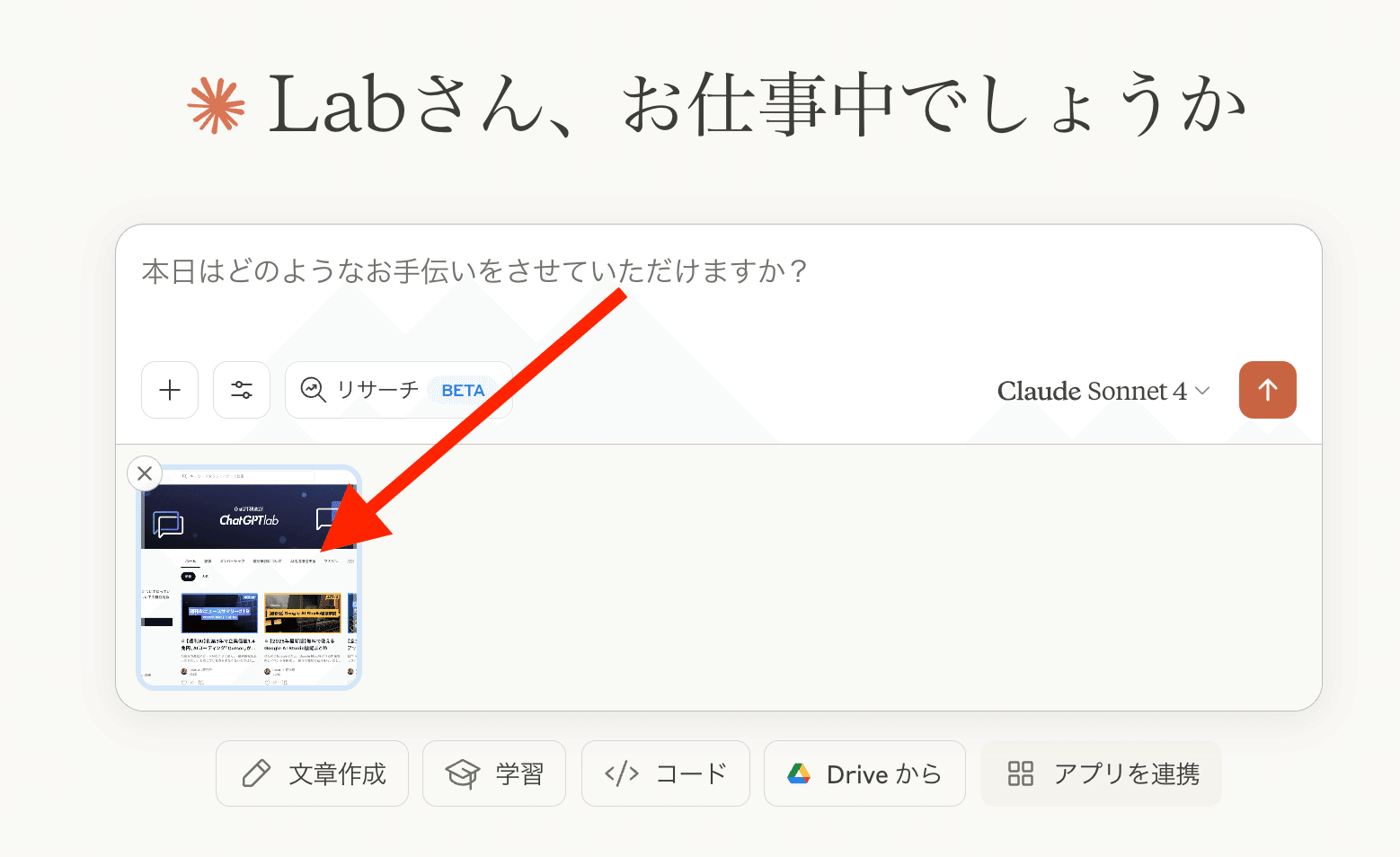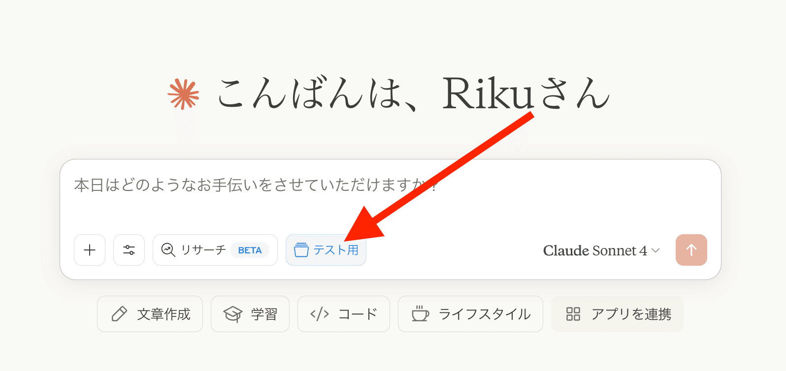 Claudeウェブアプリにログインすると、下記のようなチャット画面が表示されます。