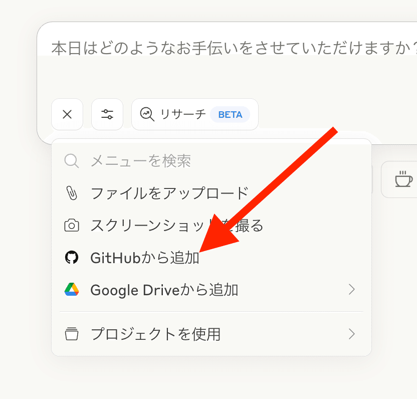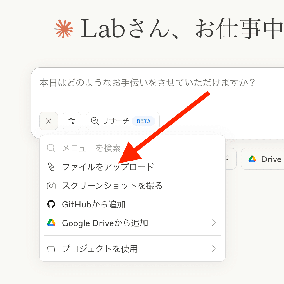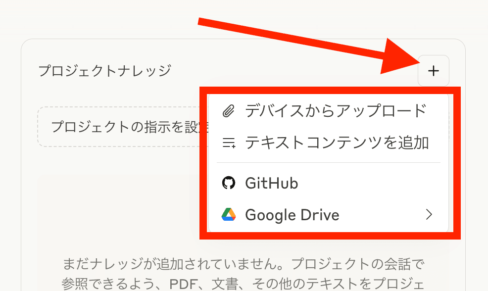 プロジェクトナレッジの「+」ボタンをクリックして、アップロードする情報を選択することができます。