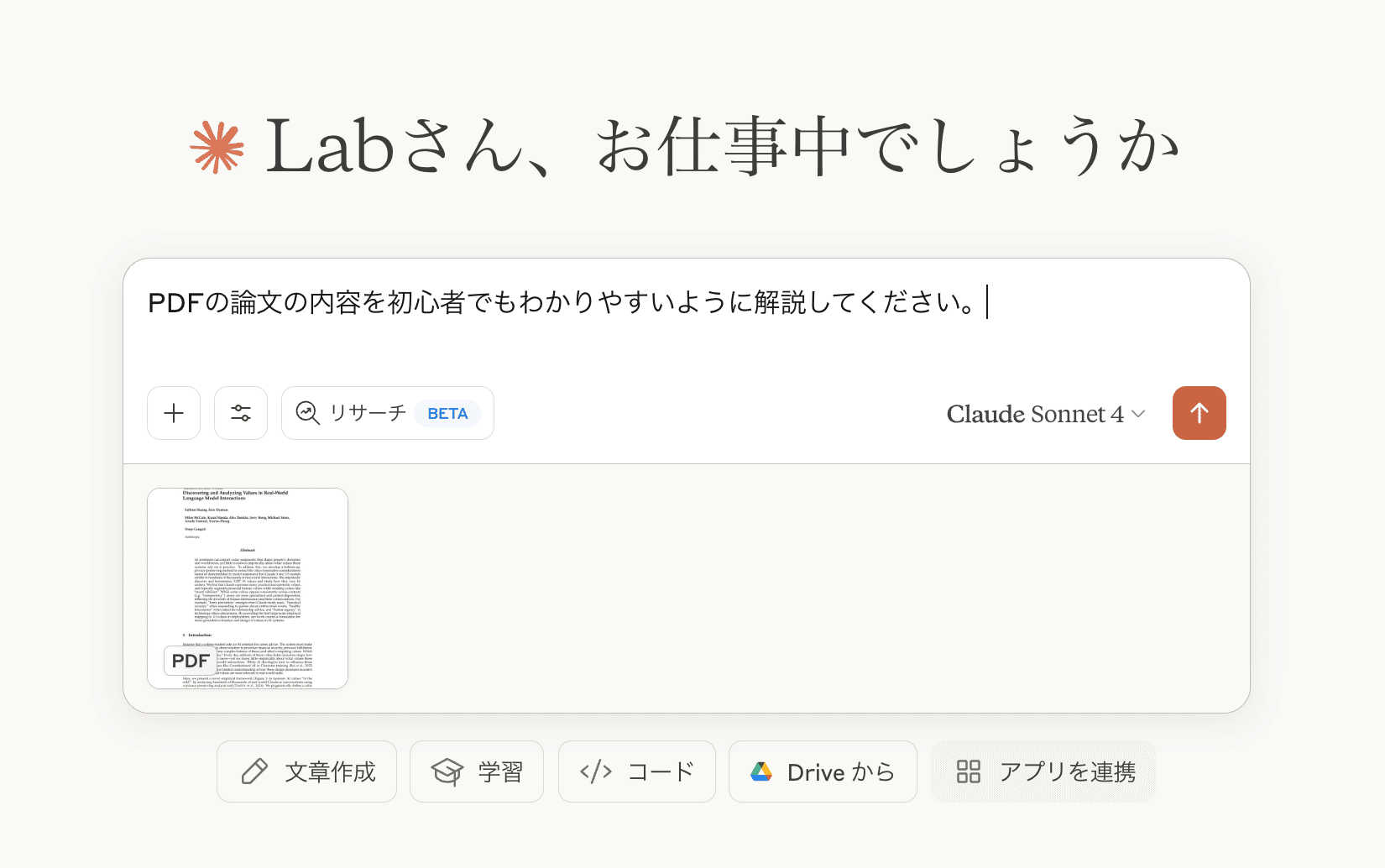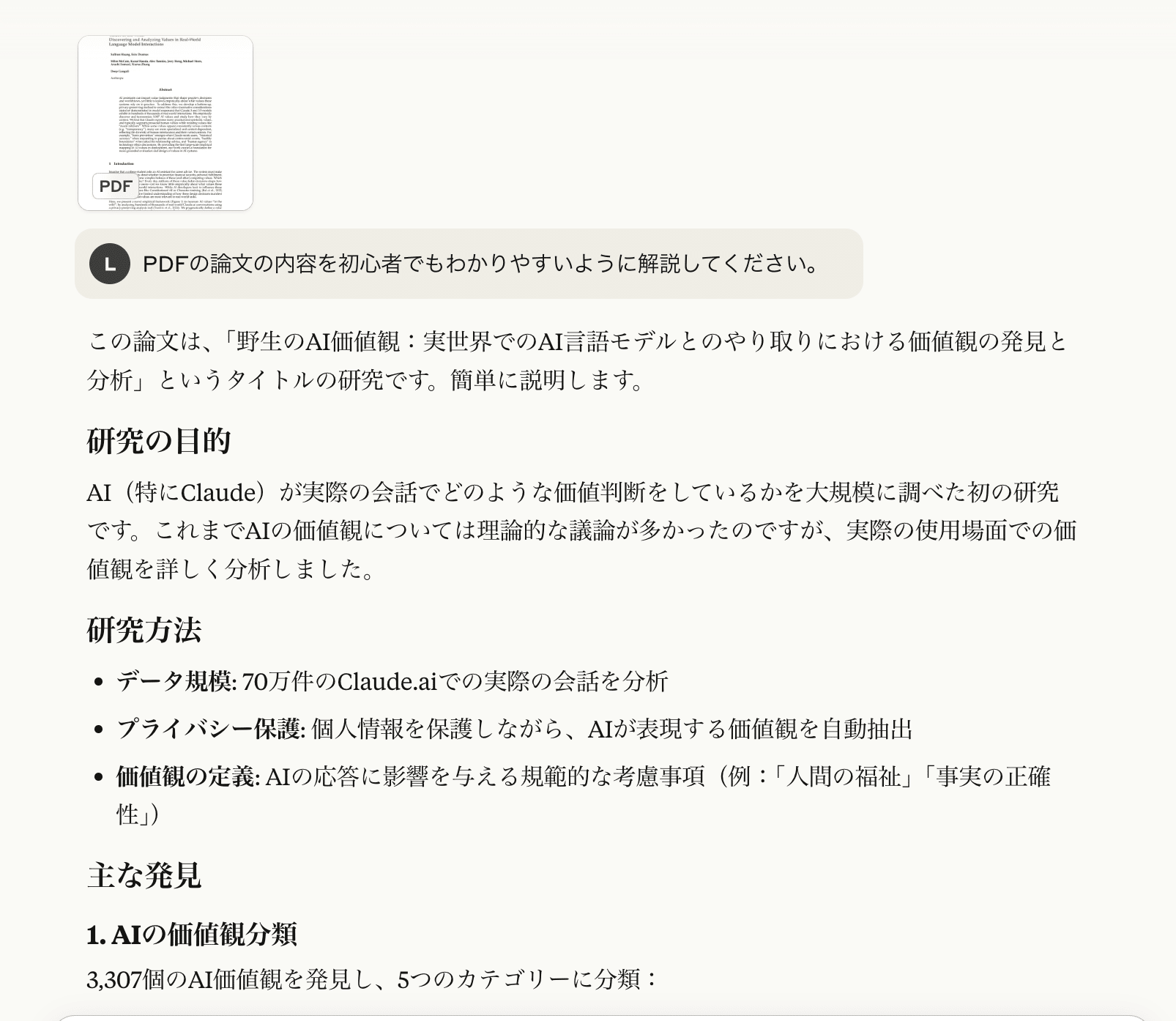 例えば、論文のPDFファイルをアップロードすれば、その内容を分かりやすく解説してもらうことが可能です。