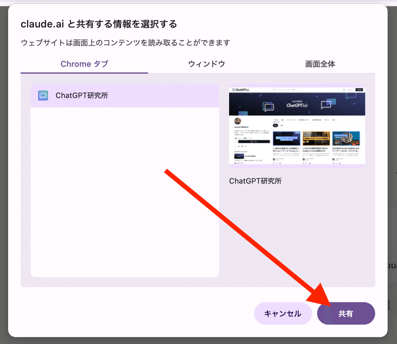 Chromeタブ、ウィンドウ、画面全体を選択できるポップアップが表示されるので、スクリーンショットを撮影したい画面を選択して、共有を押すと、選択した画面のスクリーンショットが撮影されます。