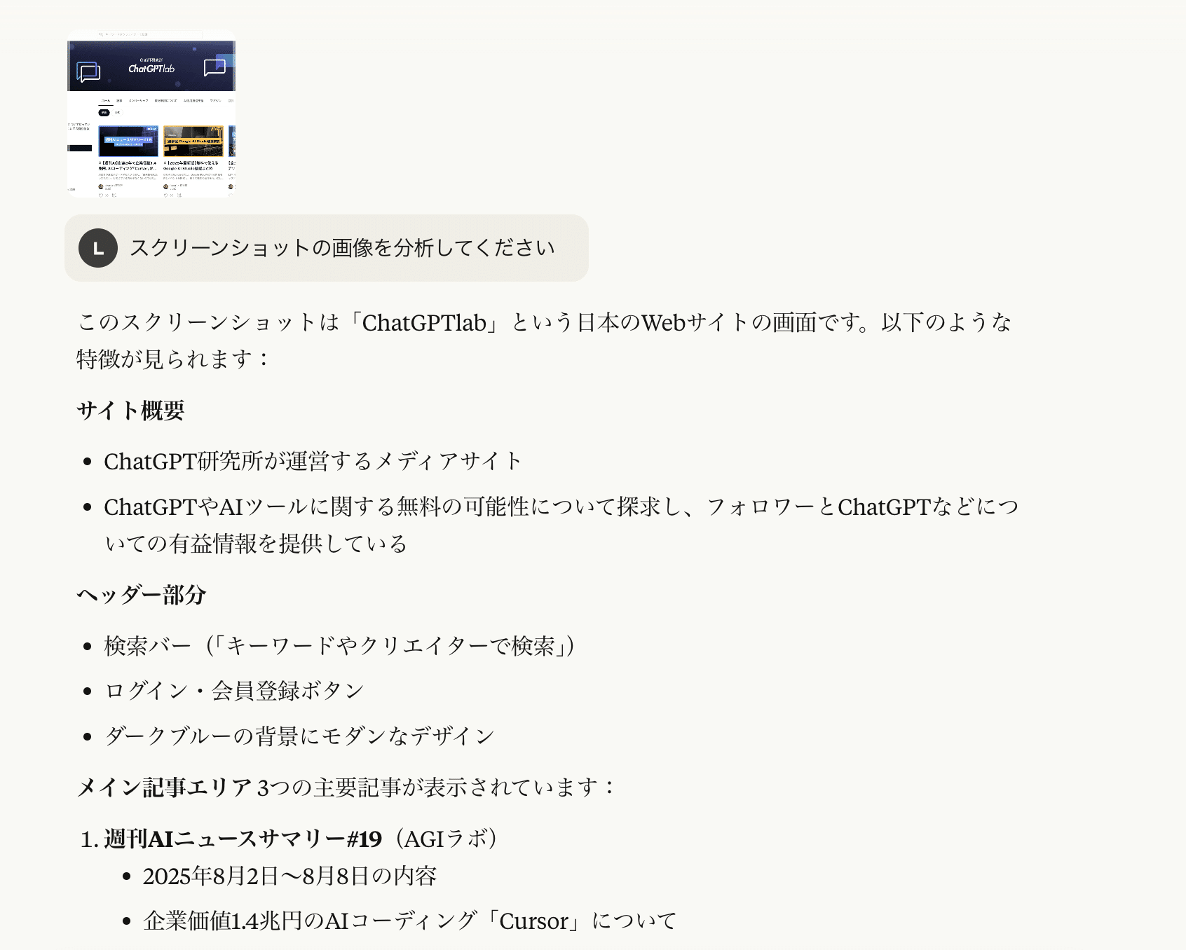 Claudeは画像解析能力もあるので、撮影したスクリーンショットを解析させることも可能です。