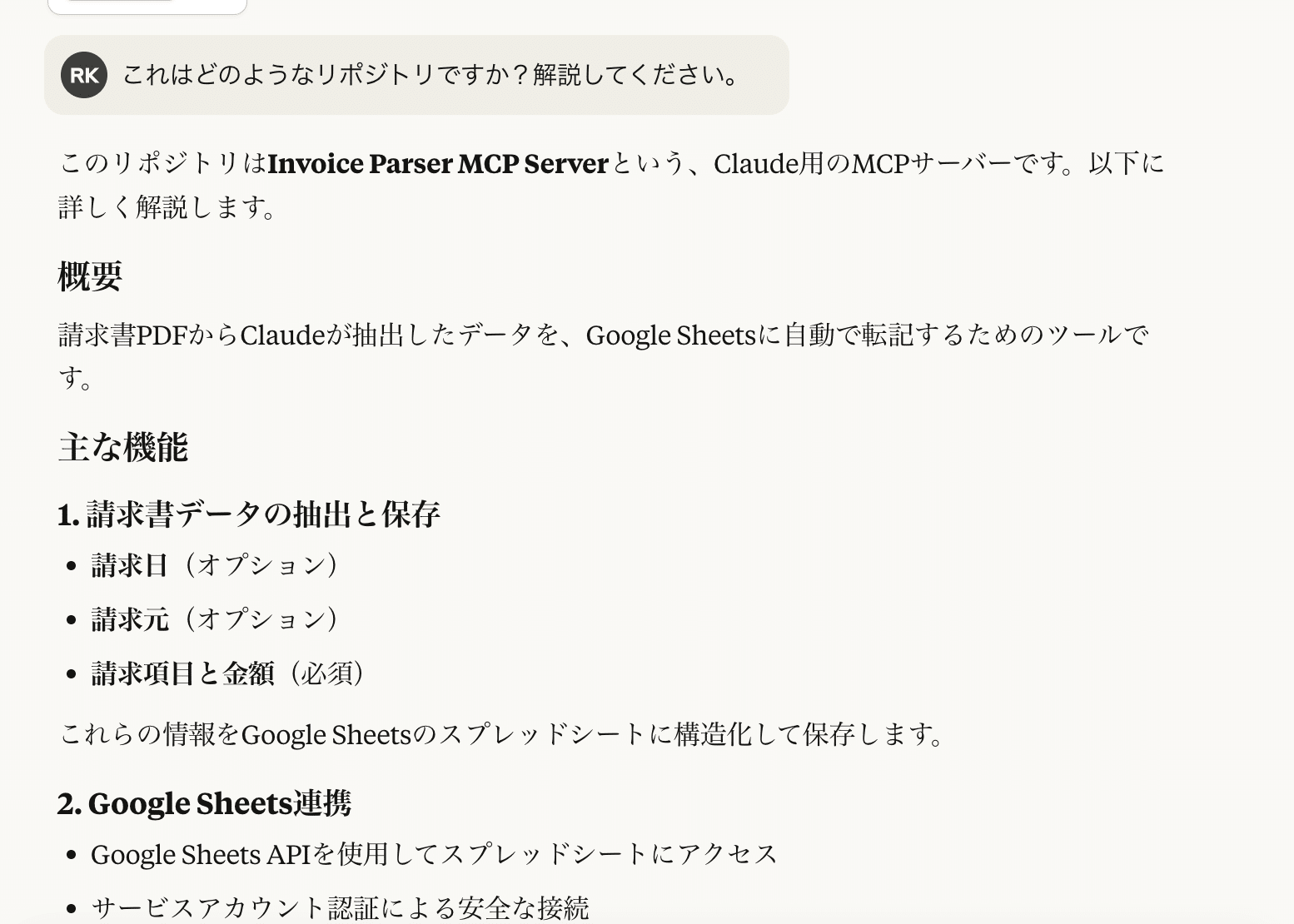 リポジトリの内容を説明するように依頼すると、しっかりとリポジトリの内容を把握した上で回答してくれました。