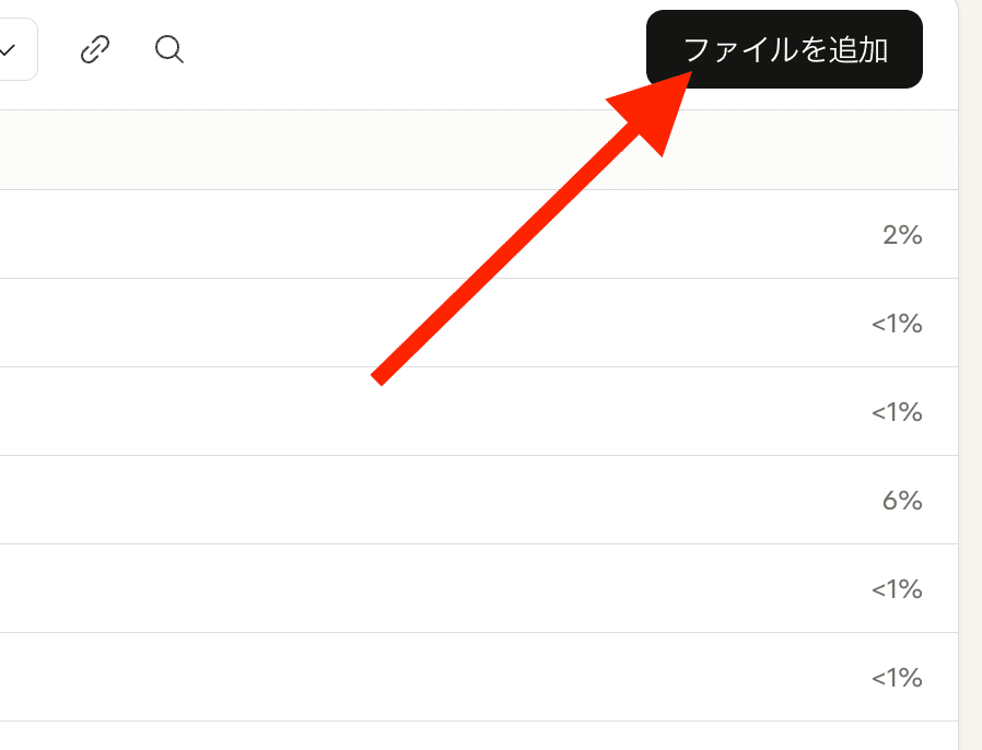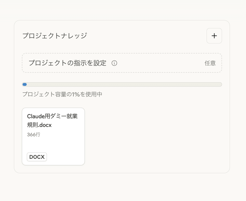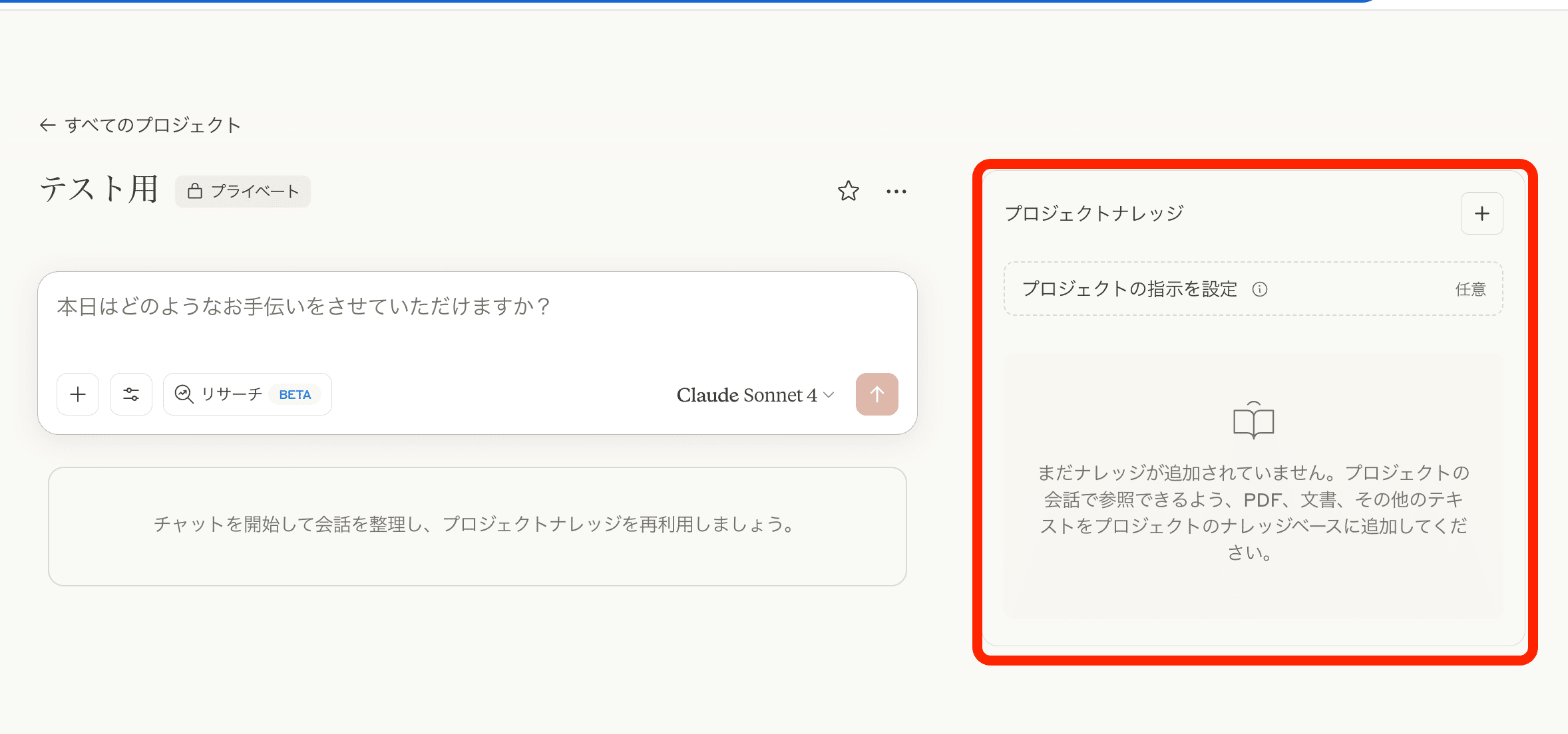 プロジェクトを開くと、その中でアップロードしたファイルをナレッジベース(知識ベース)として登録できます。