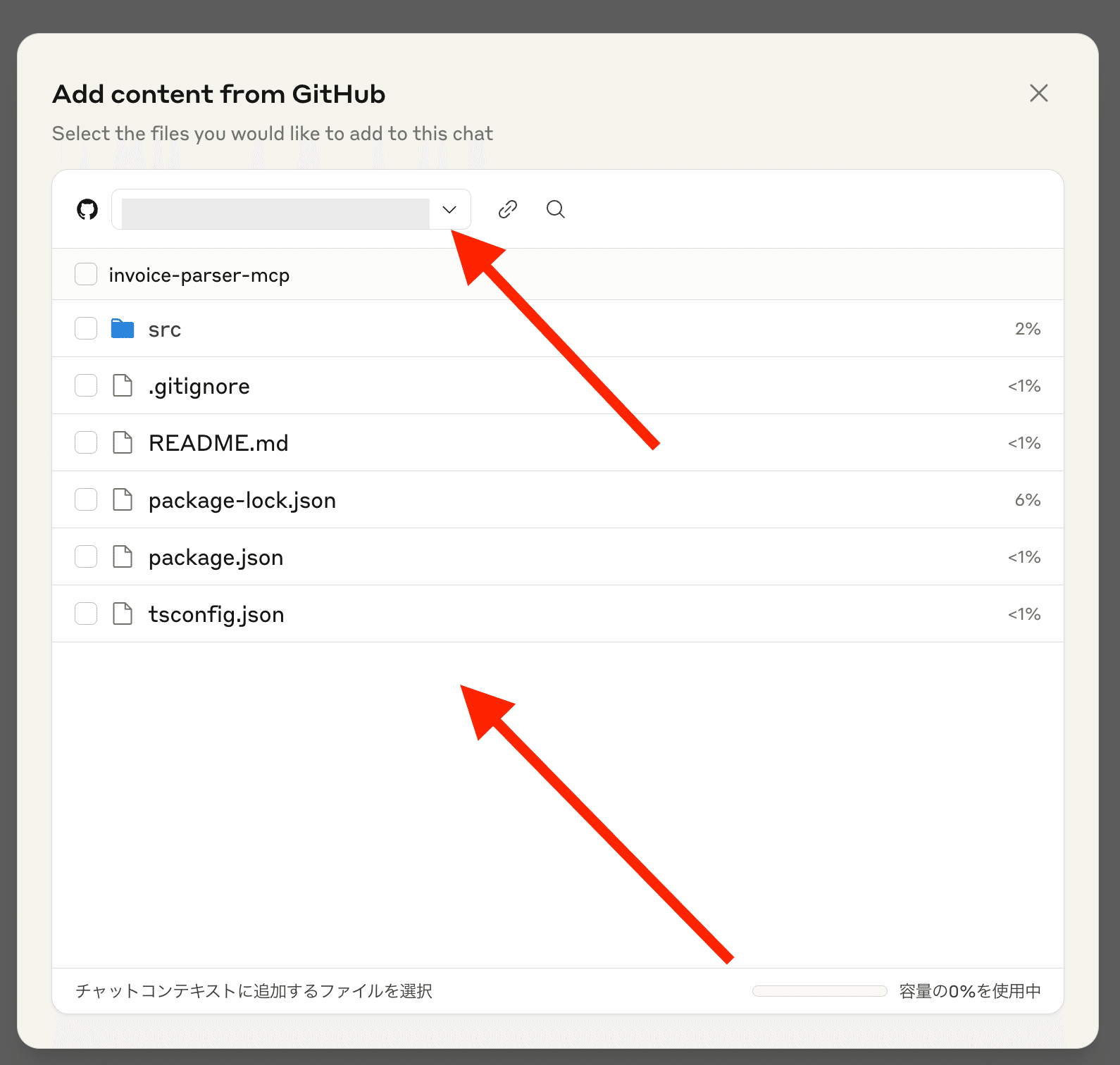 リポジトリを選択して、リポジトリ内のClaudeに共有したいフォルダやファイルを選択します。